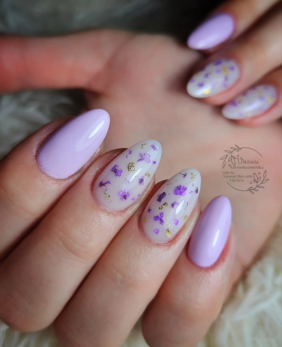 It’s playful but still elegant. The mix of solid pastel nails and textured accents makes the whole set feel artistic without being overwhelming—like tiny pieces of lavender confetti captured inside the polish.