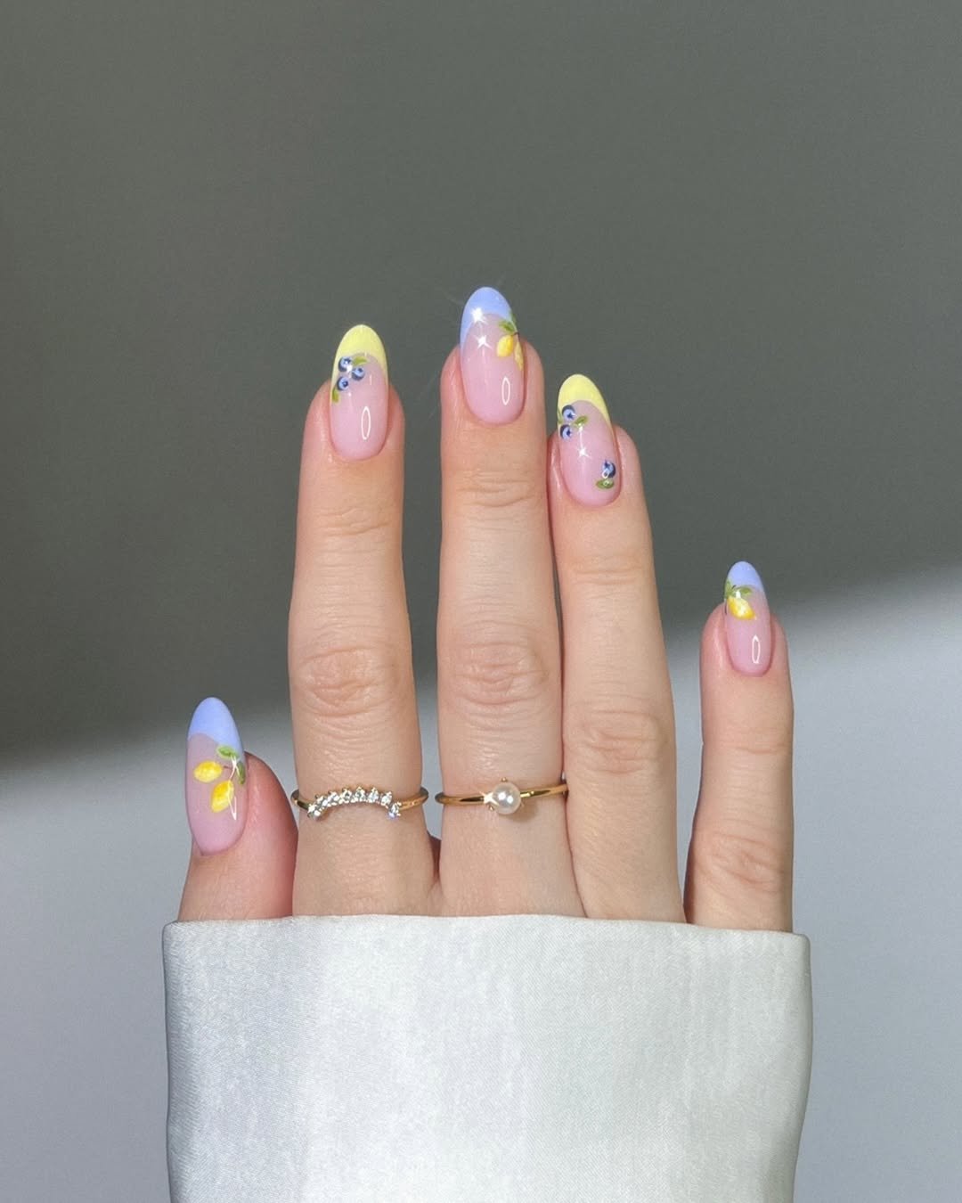These nails look like spring decided to show up in fruit form. Soft pastel tips in lemon yellow and baby blue bring a cheerful twist to the classic French style, while the tiny fruit details add the cutest finishing touch.