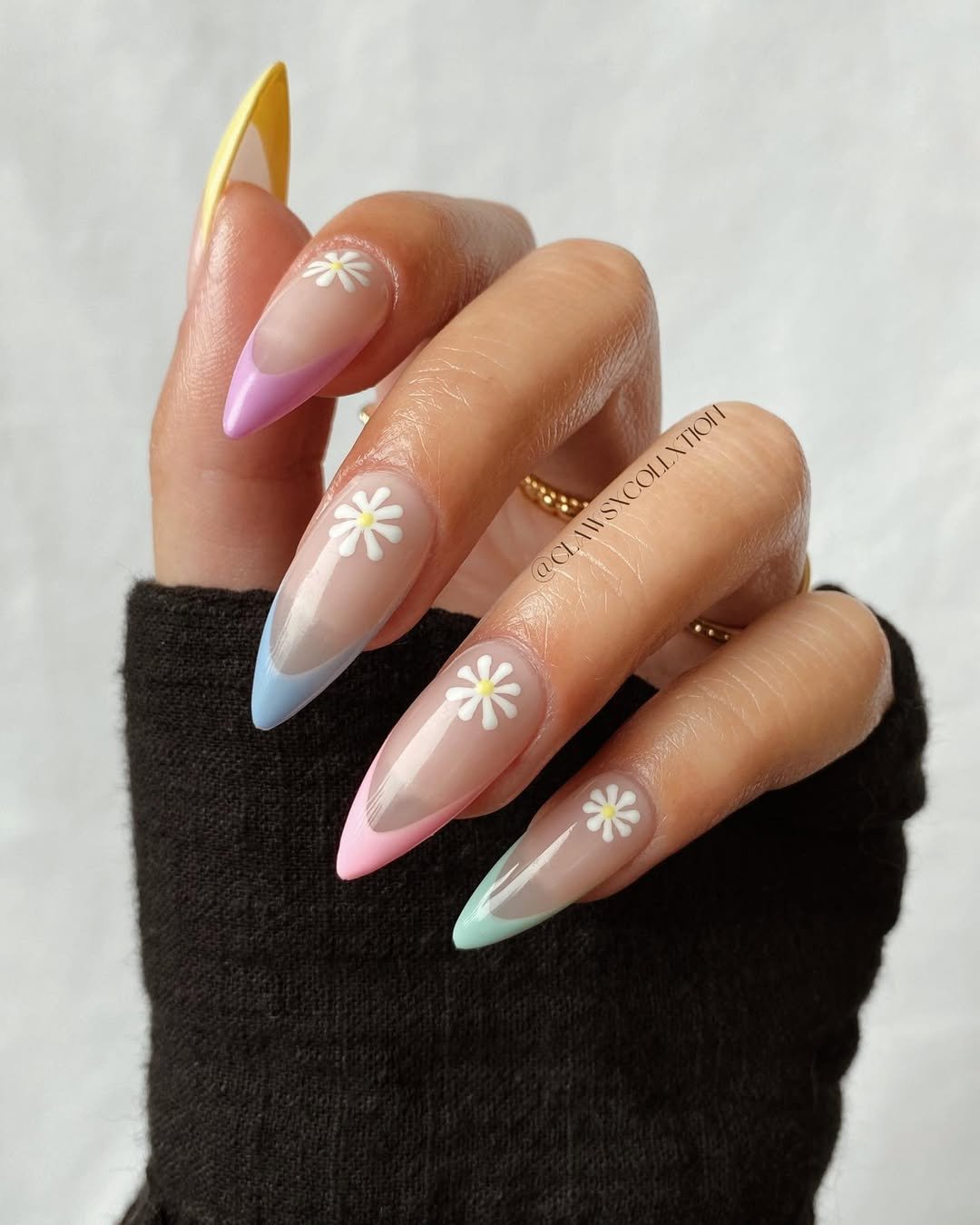 This manicure plays with pastel colors in the cutest way. Each nail gets a different soft tip—pink, blue, mint, even yellow—while the daisy accents tie everything together.