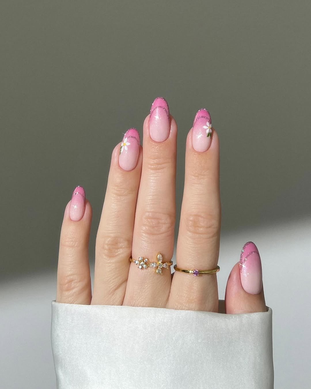 There’s something effortlessly sweet about this soft pink French design. The delicate glitter-lined tips add just a hint of sparkle, while the tiny white daisies give the manicure that perfect spring garden vibe.
