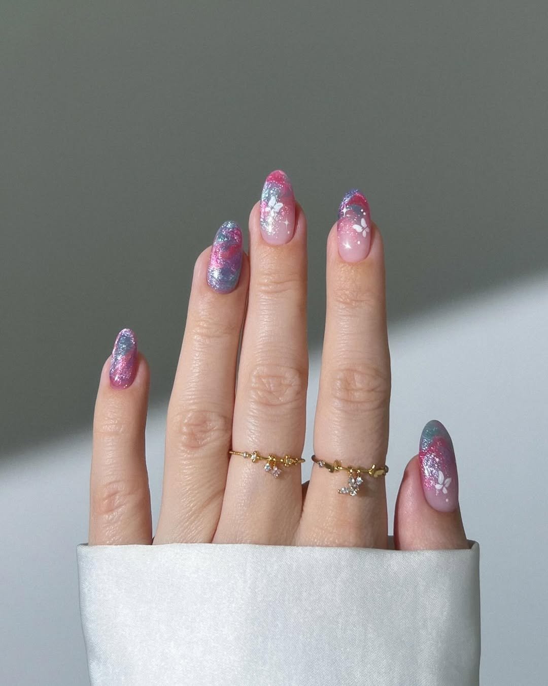 These nails feel like a tiny celebration of spring. The soft pink base paired with glitter tips and delicate butterfly accents gives the whole manicure a dreamy, whimsical vibe.