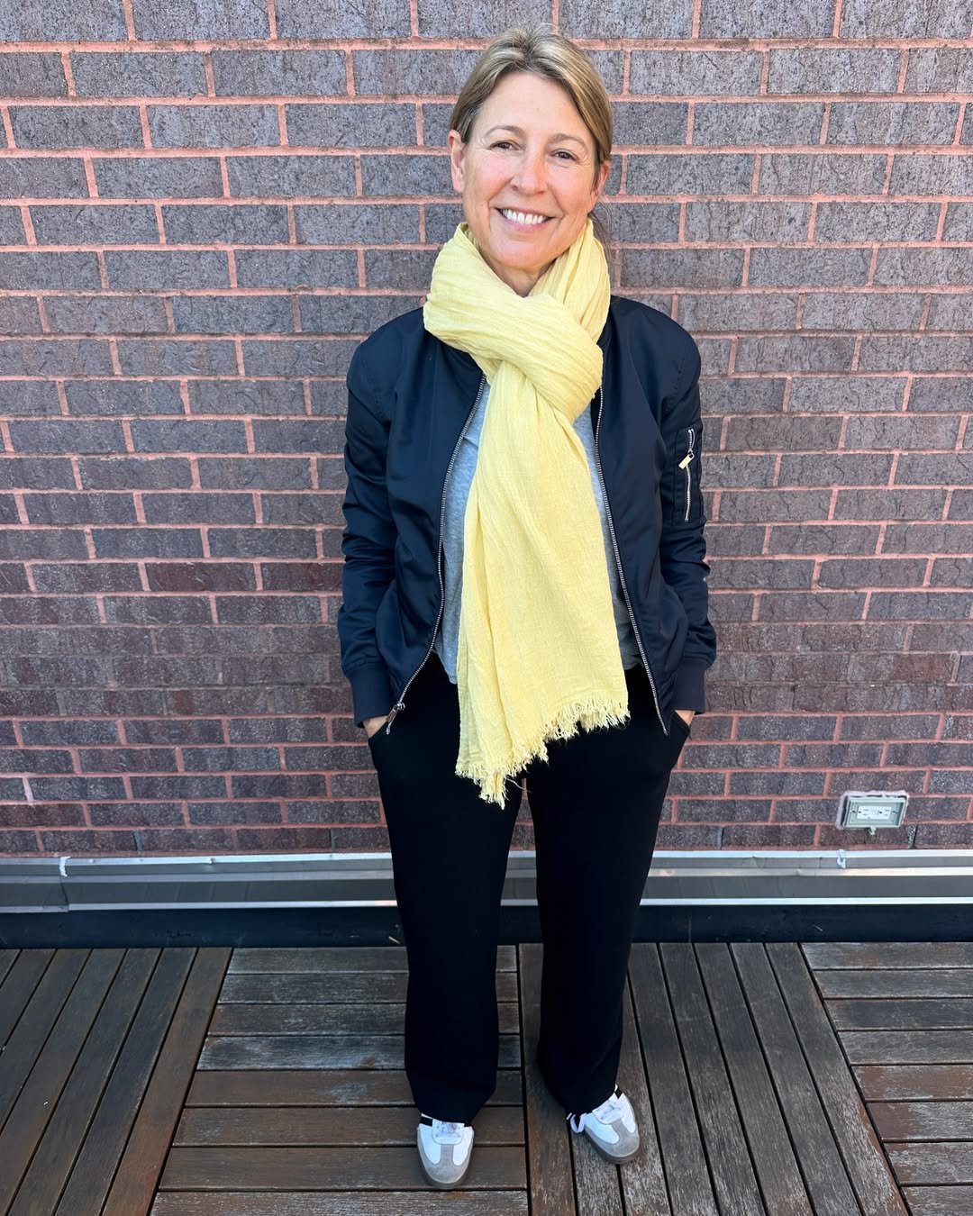 A navy bomber and black trousers could feel standard, but that soft yellow scarf changes everything. It brings warmth to the face and adds a gentle pop against the brick backdrop.