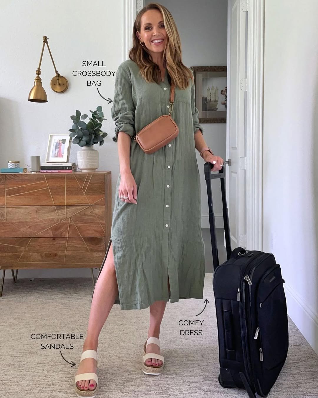 A breezy button front midi dress is such an underrated travel hero. It moves with you, keeps you comfortable, and looks polished the second you step off the plane.