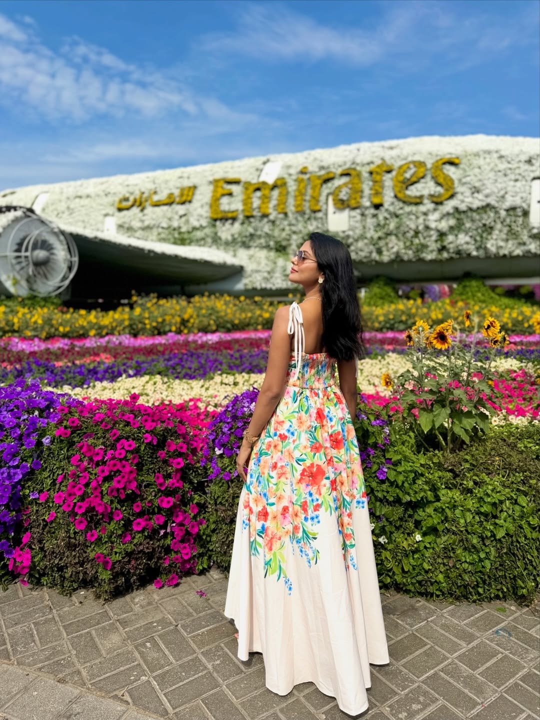 Standing in front of that Emirates floral installation feels like stepping into a postcard. The flowing maxi dress, scattered with bold blooms in coral, blue, and green, mirrors the garden around her in the prettiest way.