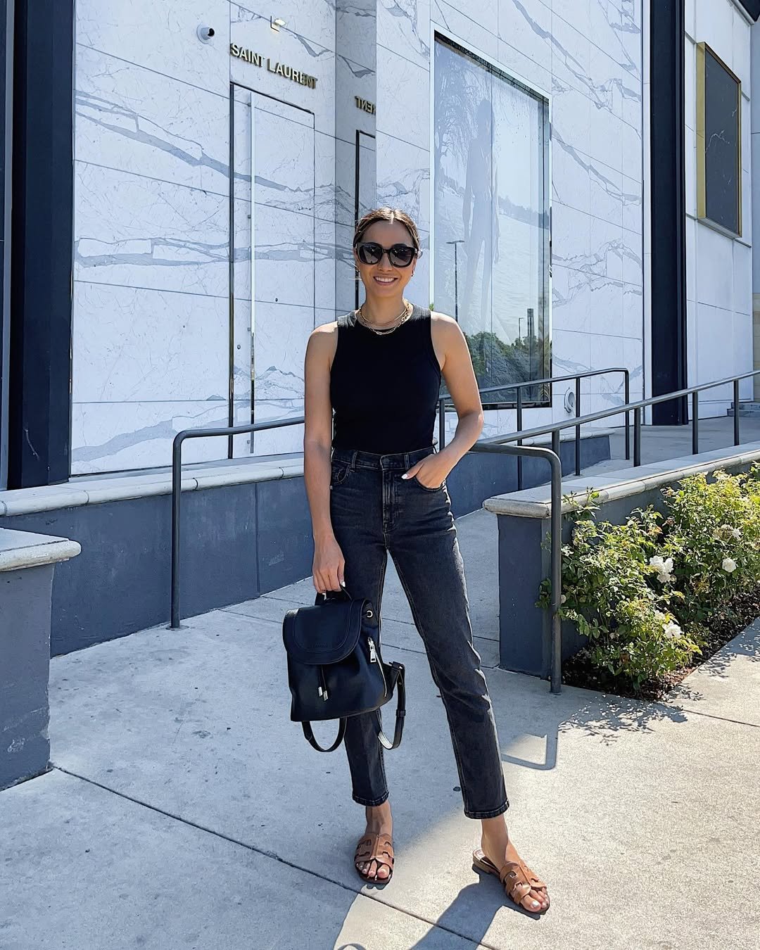 A black tank tucked into charcoal straight-leg denim is the kind of formula that never fails. Add brown leather sandals and a structured black backpack, and suddenly it feels intentional, sharp, and grown.