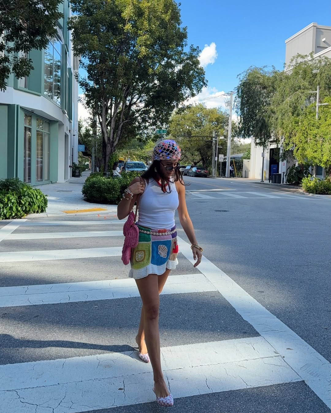 The crochet headscarf and pink shoulder bag add that carefree, vintage note that makes it feel collected rather than styled. It’s the kind of outfit you wear when you want your day to feel spontaneous.