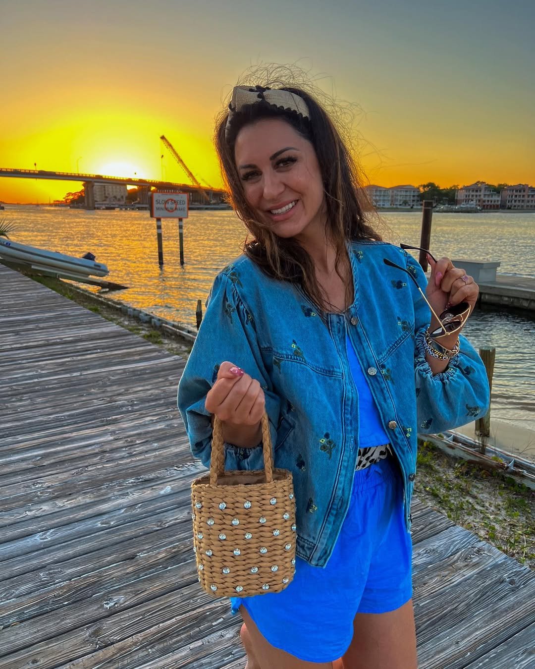 A vivid blue dress against a golden sunset feels cinematic in the best way. The denim jacket layered on top keeps it approachable, while the woven bucket bag adds texture.