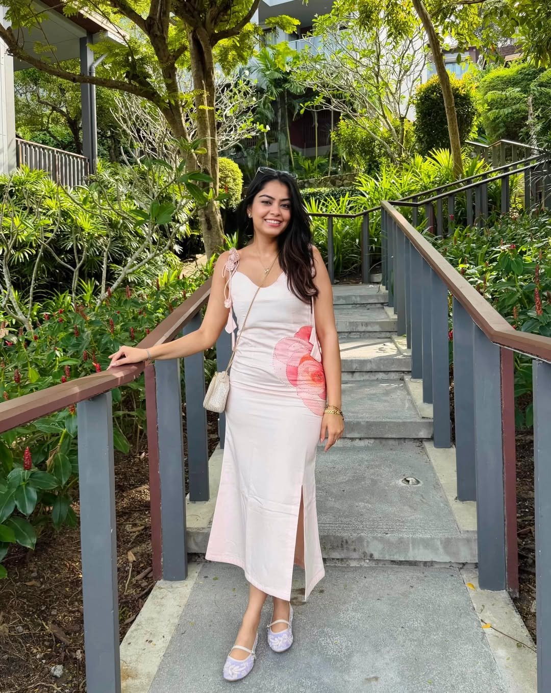 There is something so refined about a ribbed knit dress in creamy ivory, especially when it hugs the body and falls into a soft midi flare. Set against lush palms and stone steps, this look feels like a quiet luxury moment on vacation. The subtle texture does all the work, no loud print required.