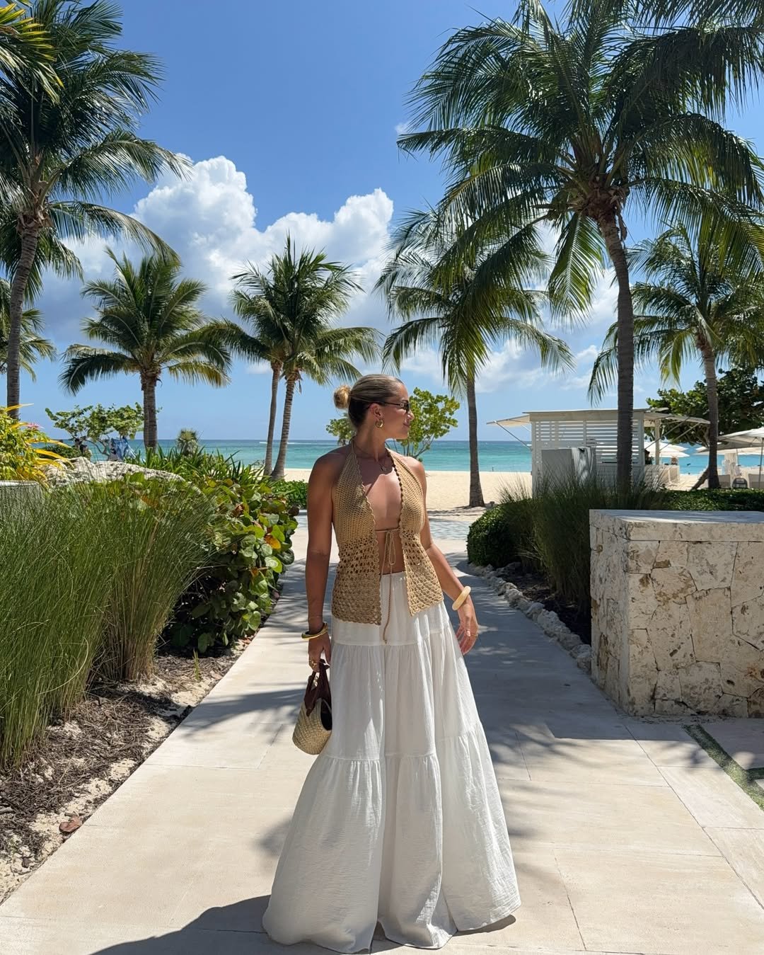 A crochet halter top and flowing white skirt with palm trees in the background? It’s giving barefoot luxury. The textures do all the work here, earthy, light, and made for salty air.