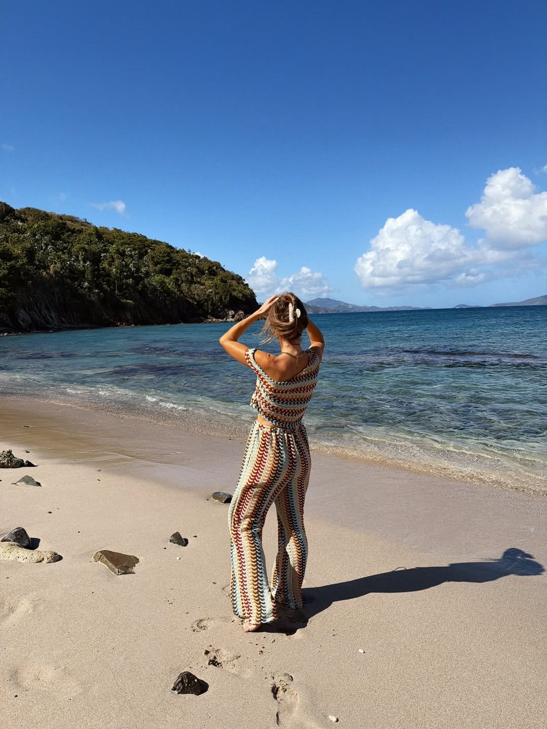 Barefoot on the sand in a crochet two-piece that catches the light with every step, this look is pure seaside freedom. The zigzag knit pattern gives it a retro pulse, while the open back and easy silhouette make it feel current and relaxed.