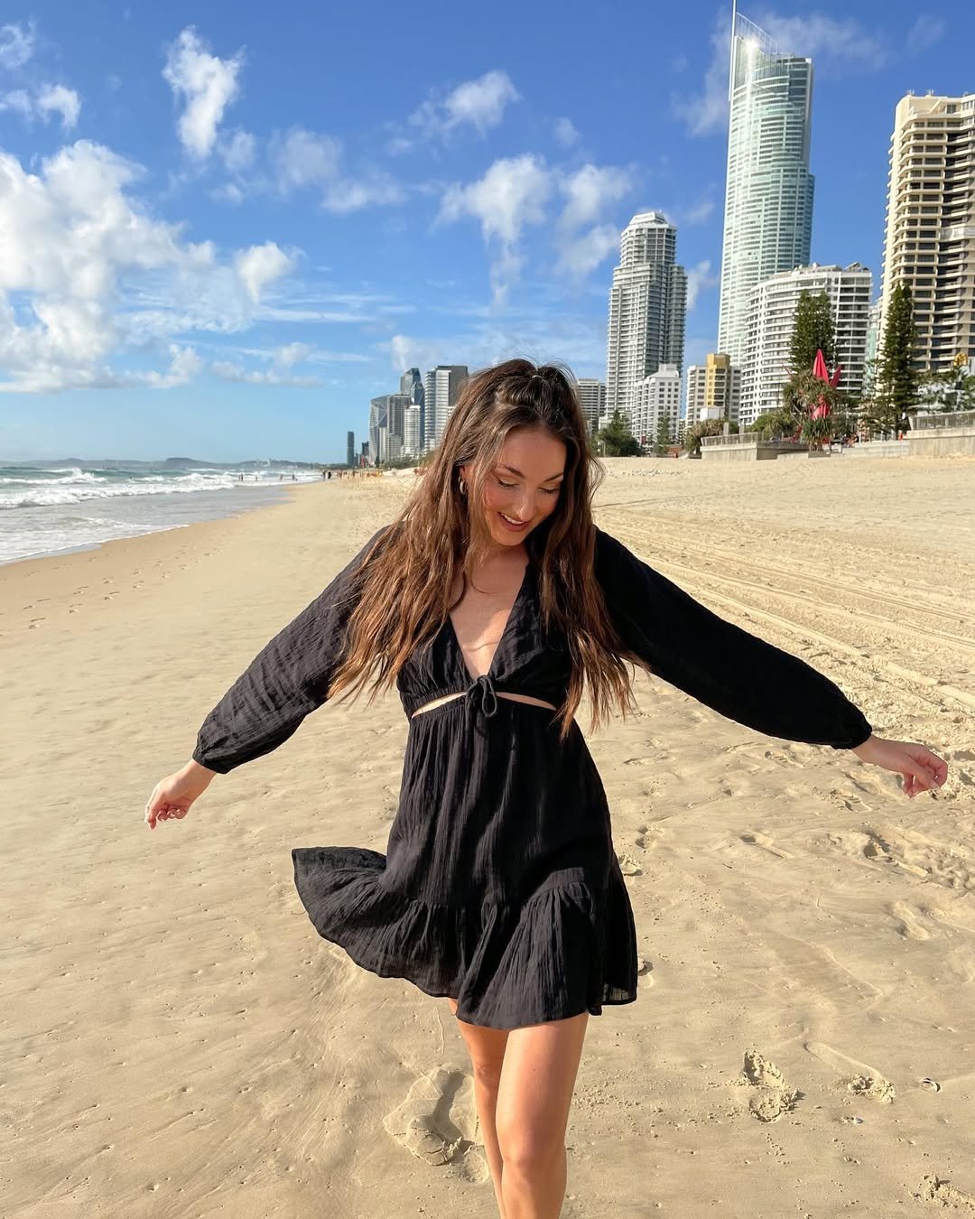 There’s something about a breezy black mini on the sand that just hits. The flowy sleeves, the subtle cutout, the way it catches the wind—it’s giving “spontaneous sunset stroll” energy with zero overthinking required.