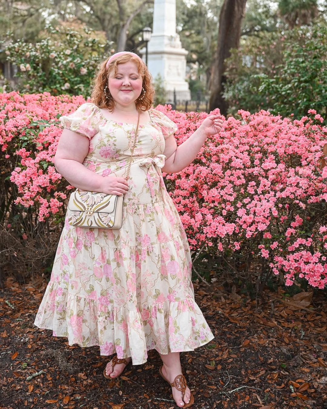 A soft floral midi surrounded by blooming pink bushes? It’s storybook spring at its finest. The puff sleeves and tie waist give it shape, while the print keeps things light and romantic.