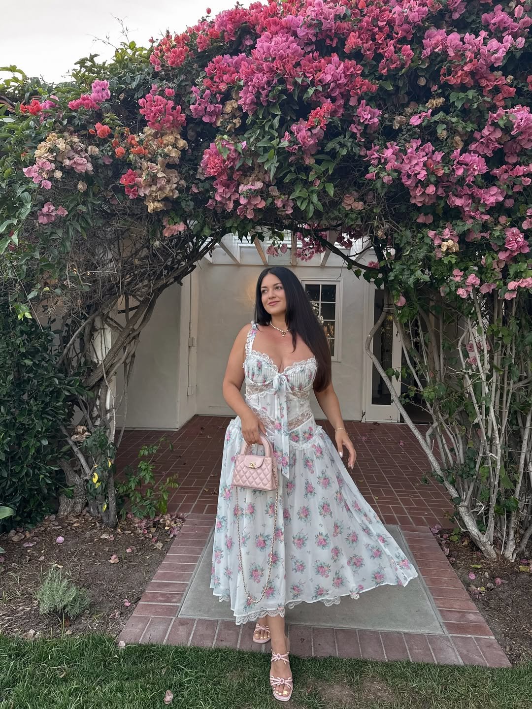 There’s something so charming about a floral midi under a canopy of blooms. The corset-style bodice and soft pink print feel feminine without tipping into costume territory. It’s classic spring, but elevated.
