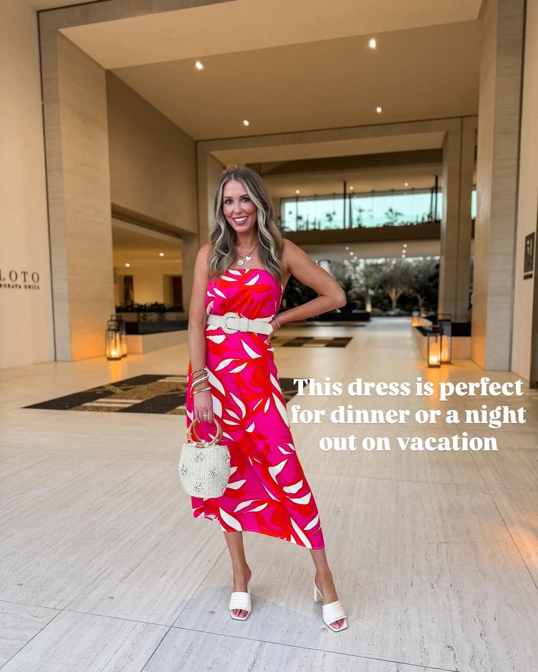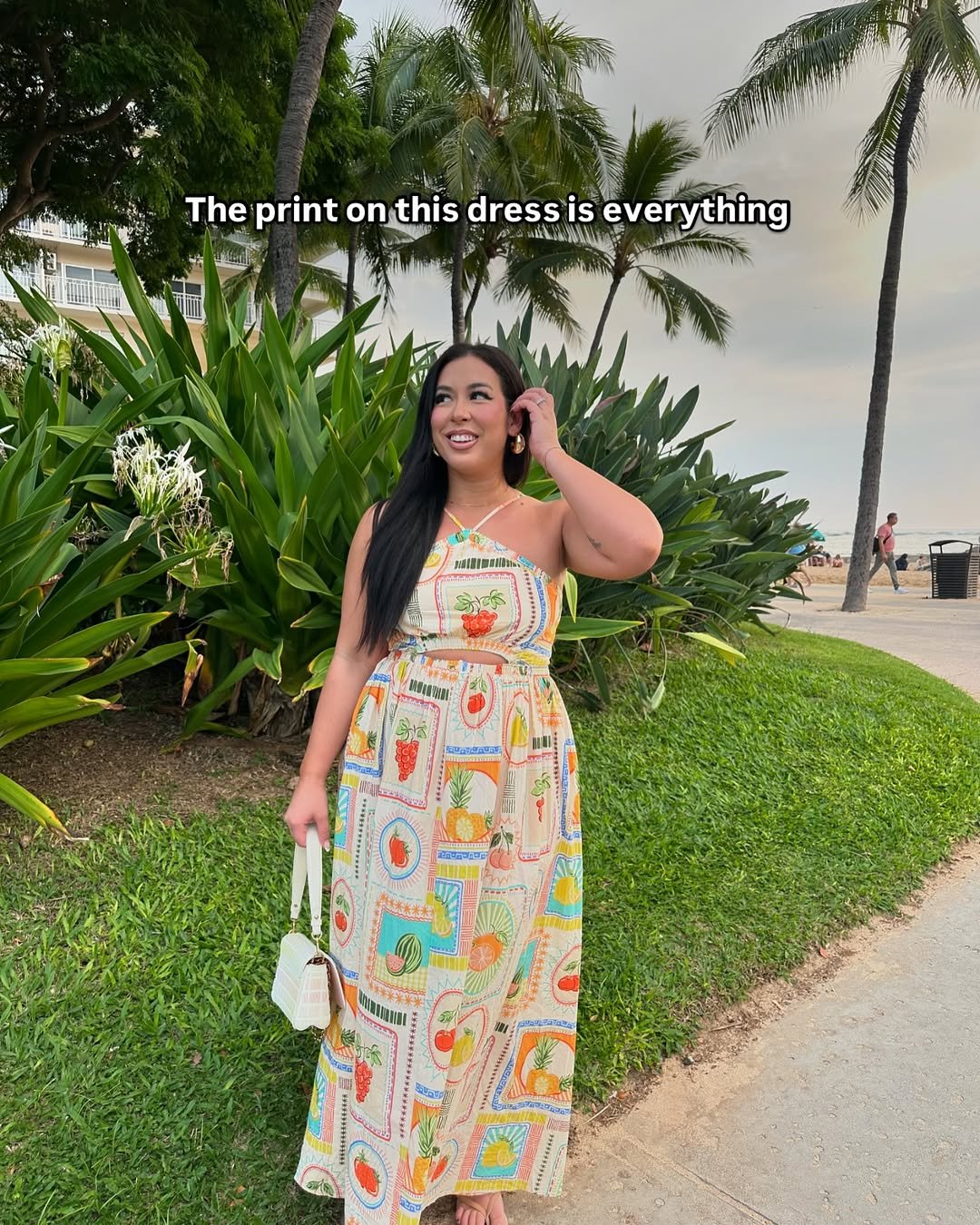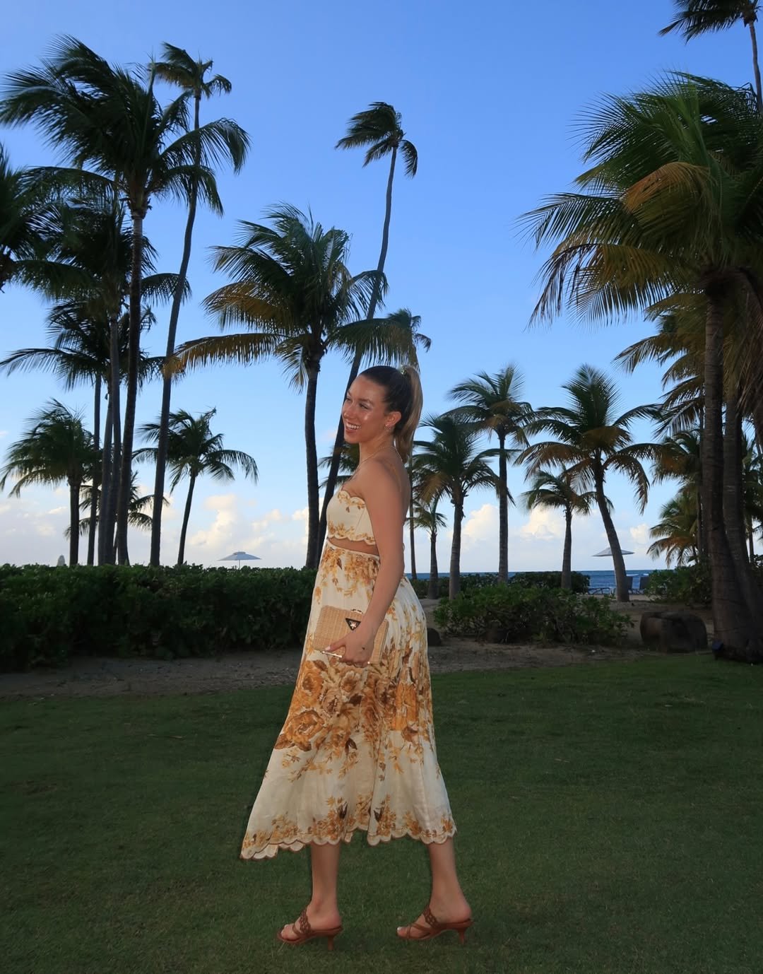 It is bright, confident, and undeniably fun. The woven clutch and stacked bracelets tie it all together, proving that sometimes vacation style is about leaning into color and letting it carry the vibe.