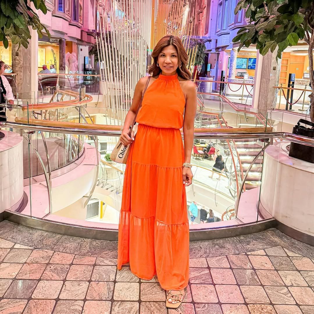 This is the dress you pack when you want to feel like the main character. That bold tangerine maxi against a candy-colored backdrop feels equal parts resort glam and city chic. The halter neckline keeps it sleek, while the tiered skirt brings in that soft movement every spring vacation needs.