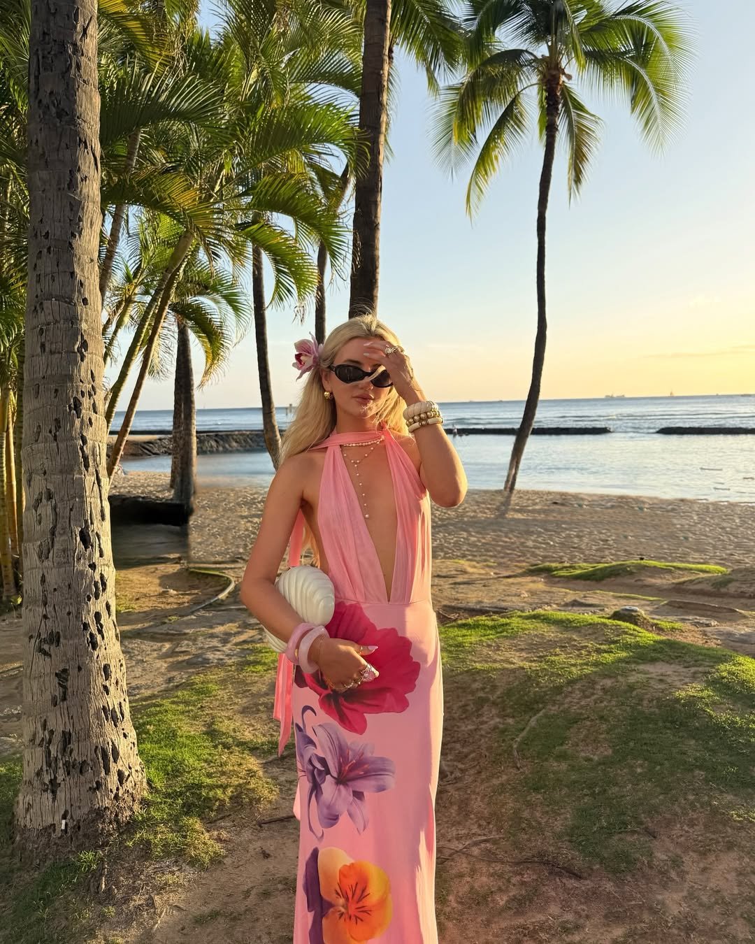 A plunging halter in blush pink with bold floral blooms is not here to whisper. It is here to glow. Framed by palms and golden hour light, the dress feels cinematic, like the final scene of a tropical getaway.