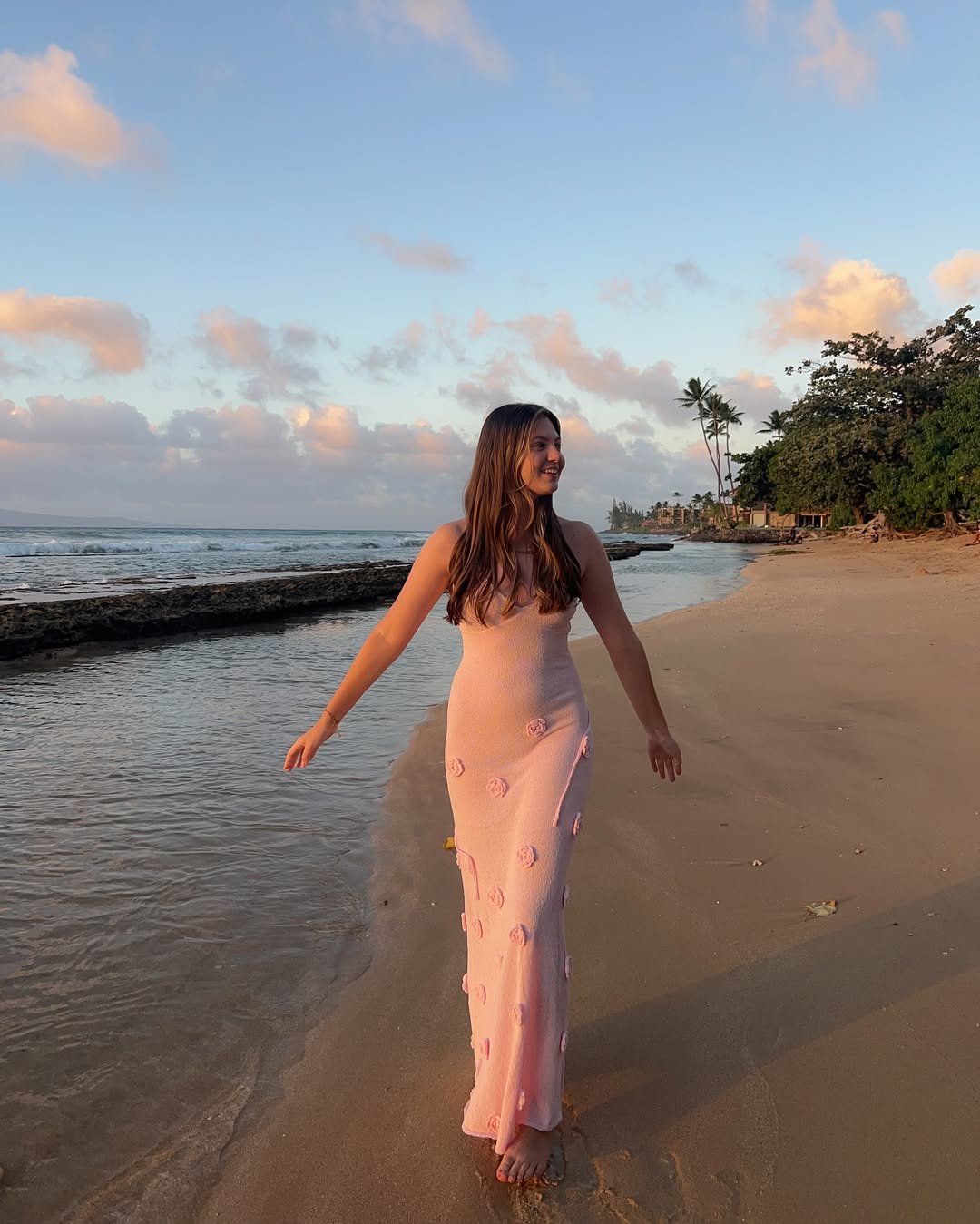 A blush-toned maxi on the beach at golden hour just feels right. The subtle texture and delicate detailing make it dreamy without being fussy.