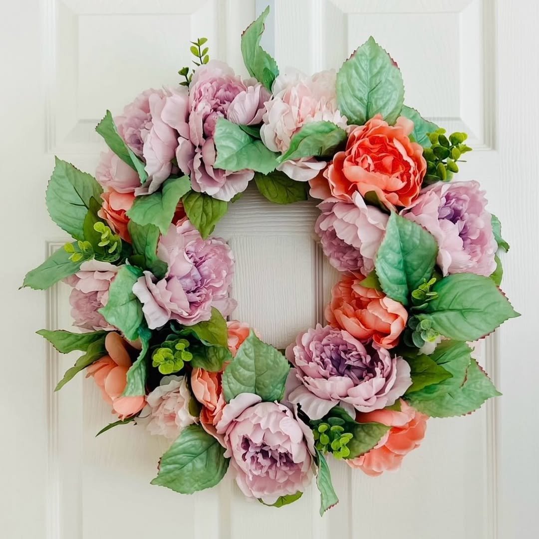 This one feels like spring in its most romantic form. Full peonies in blush and soft coral tones create a plush, almost cloud-like ring that brings instant softness to a plain door.