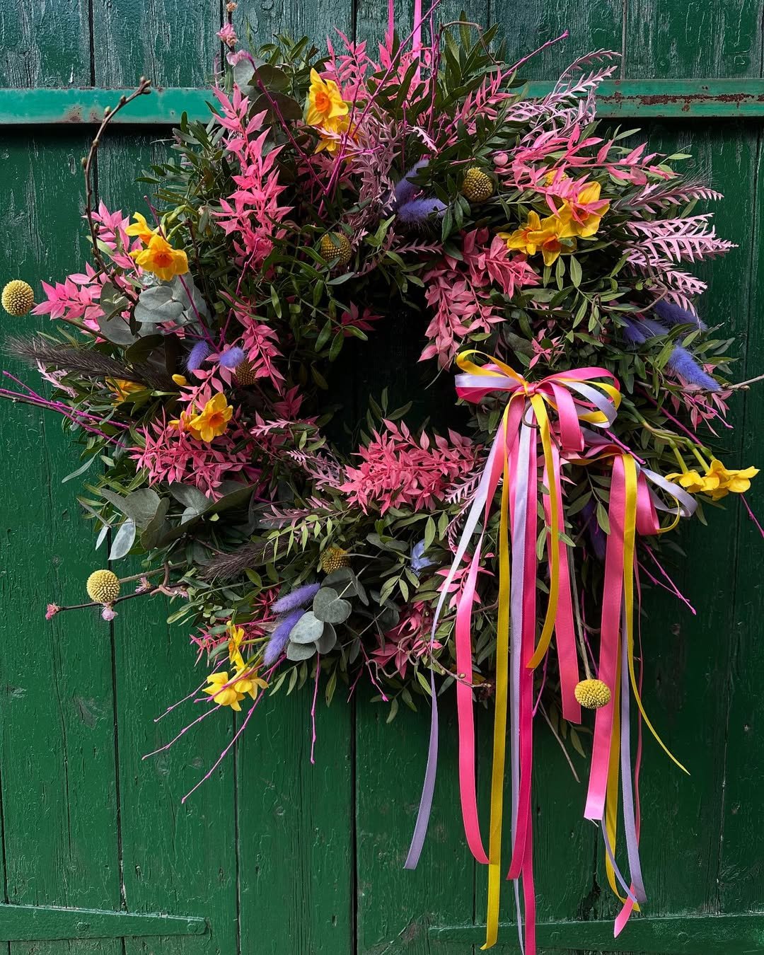 Bright pink foliage, pops of yellow, and long flowing ribbons create a wreath that feels full of movement and energy. It almost looks like it’s dancing against the door.