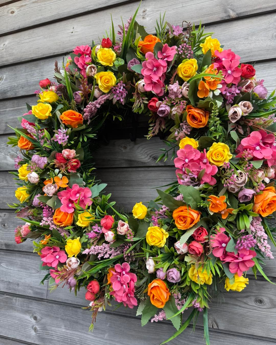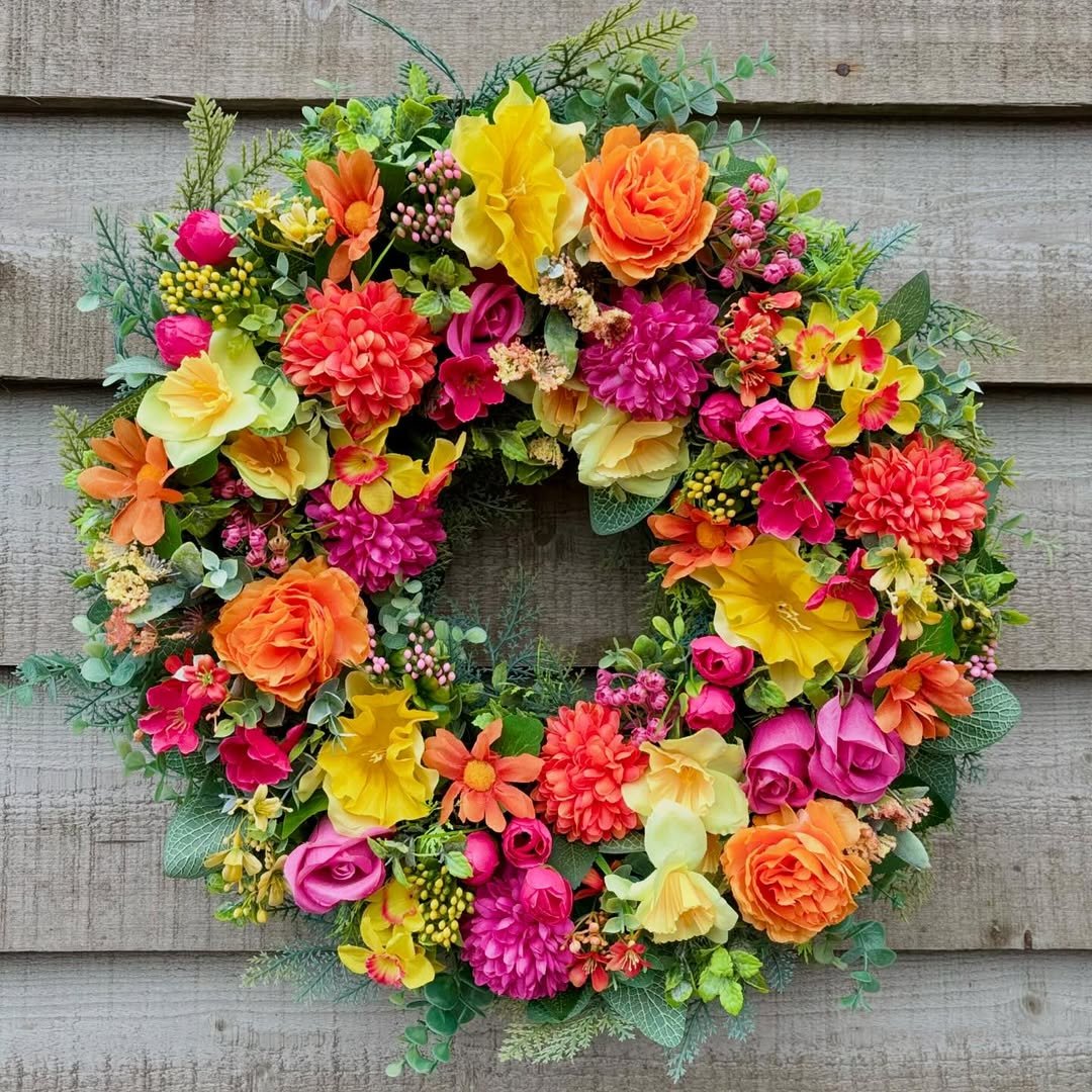 If you love color, this wreath doesn’t hold back. Bright yellows, pinks, and oranges are layered densely for a full, joyful look that instantly lifts your mood.