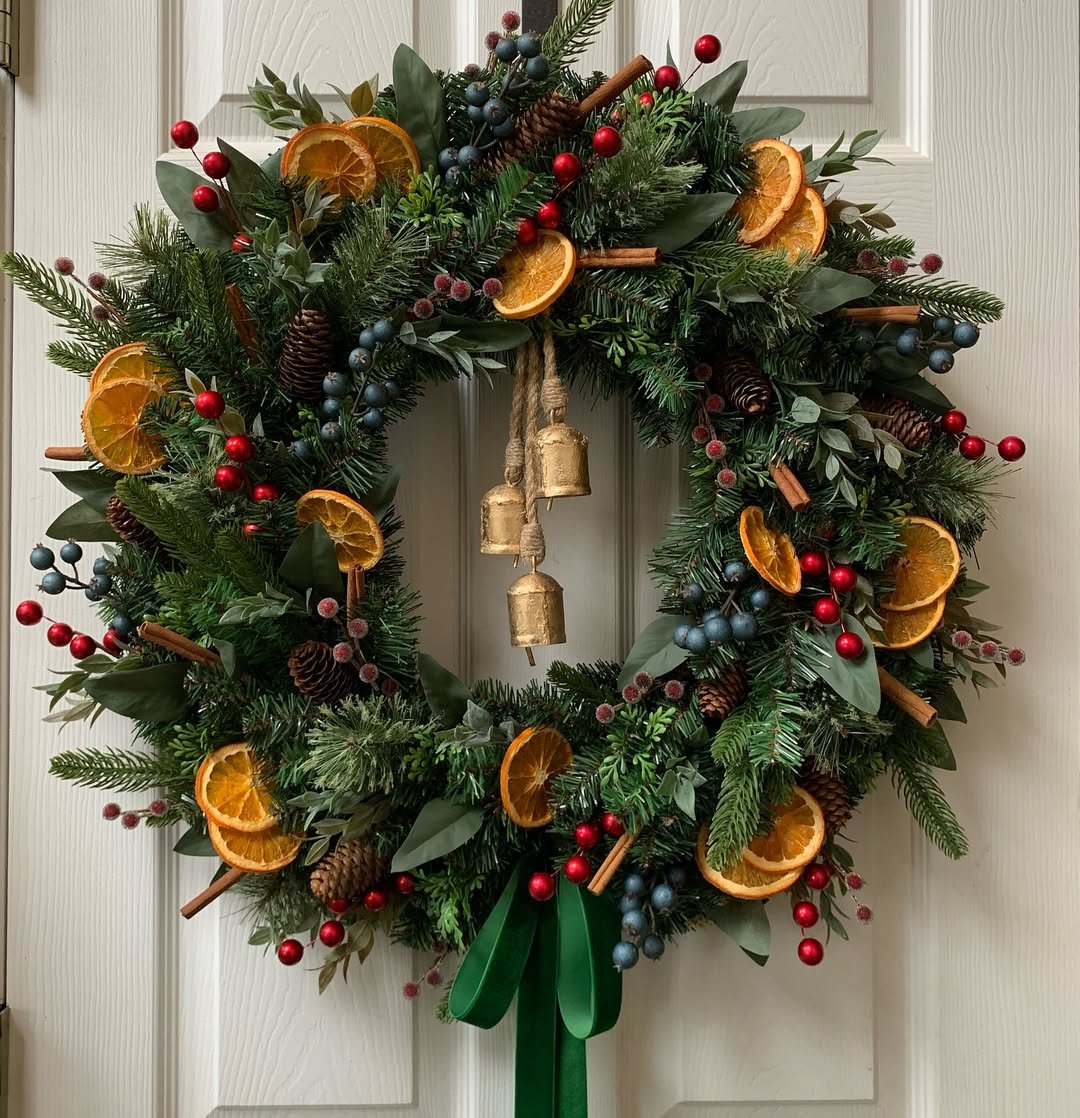 Unexpected, but it works. Rich greenery layered with dried orange slices, berries, and little bells creates a look that feels both fresh and grounded.