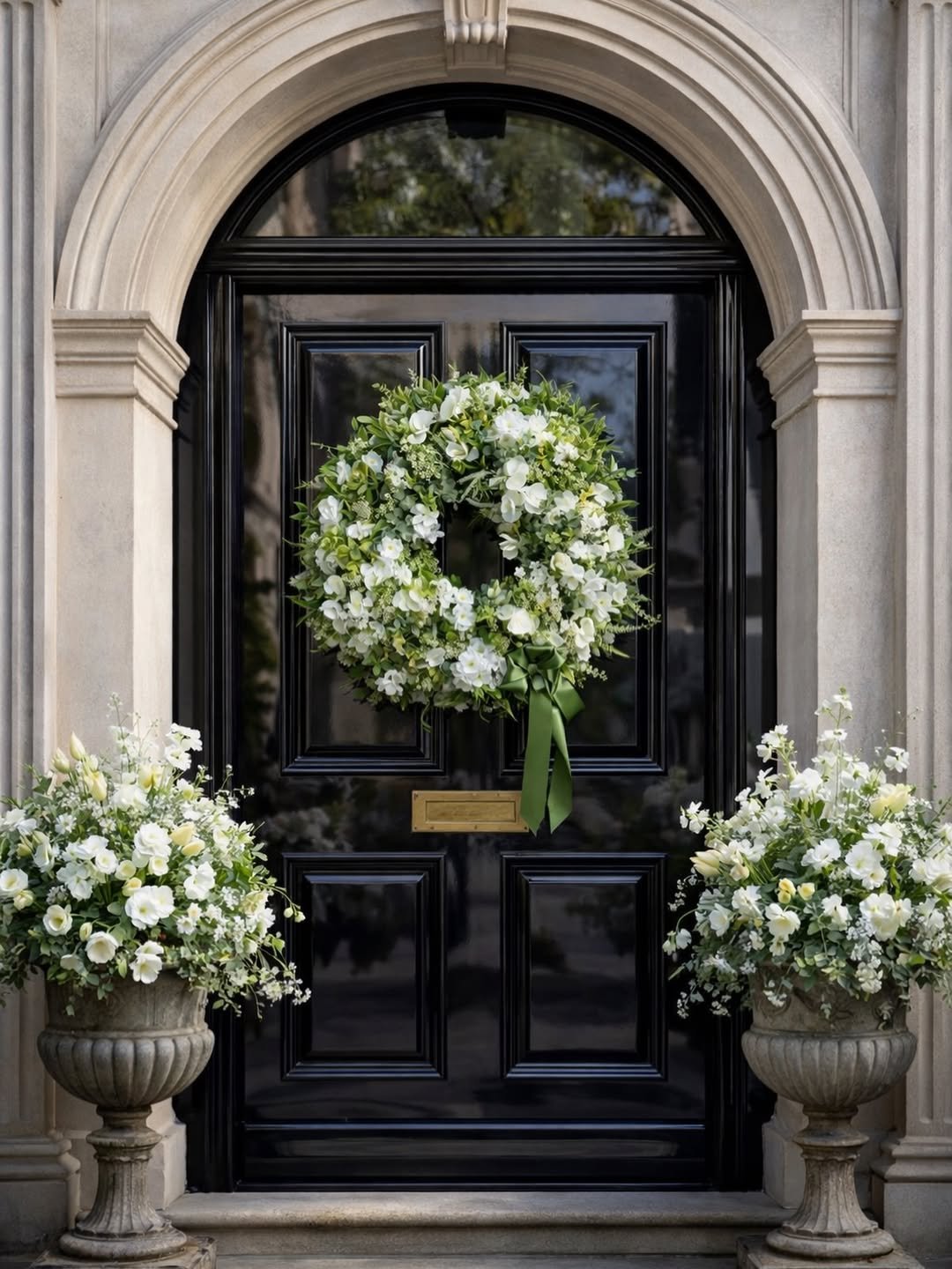This isn’t just a wreath, it’s a full moment. Crisp white florals paired with structured greenery create a look that feels timeless, especially against that deep black door.