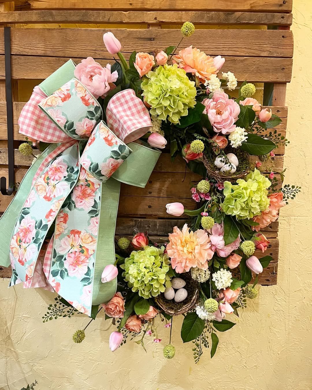 This wreath feels like it belongs in a sunlit cottage garden. Hydrangeas, soft pink blooms, and tiny nest details are tied together with a wide patterned ribbon that steals just enough attention.