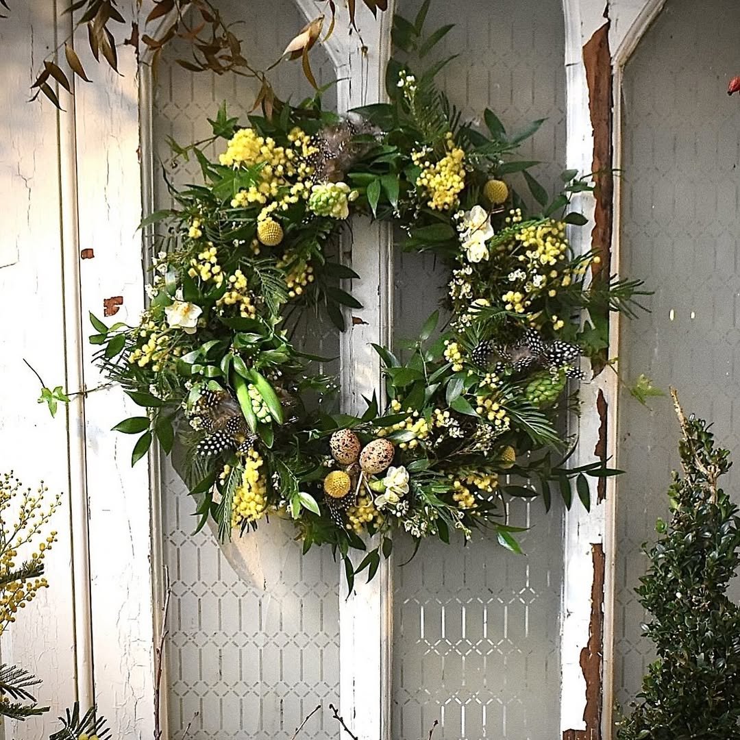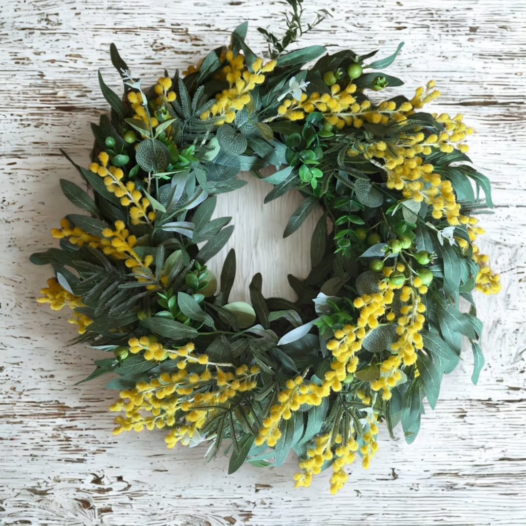This wreath brings texture front and center. The soft yellow mimosa stems peek through layers of eucalyptus and olive-toned leaves, creating that wild, just-gathered look.