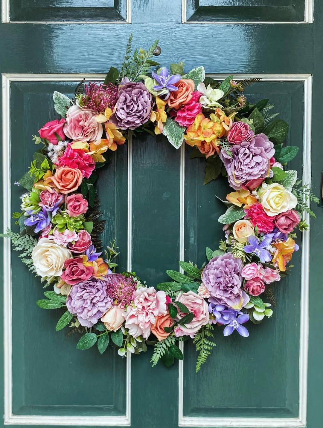 A wreath that doesn’t hold back. Layers of roses, peonies, and vibrant florals fill every inch, creating a lush, almost painterly effect against that deep green door.