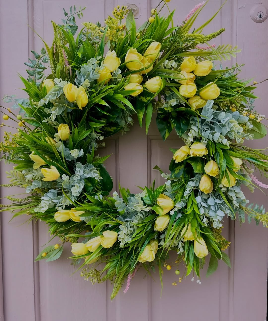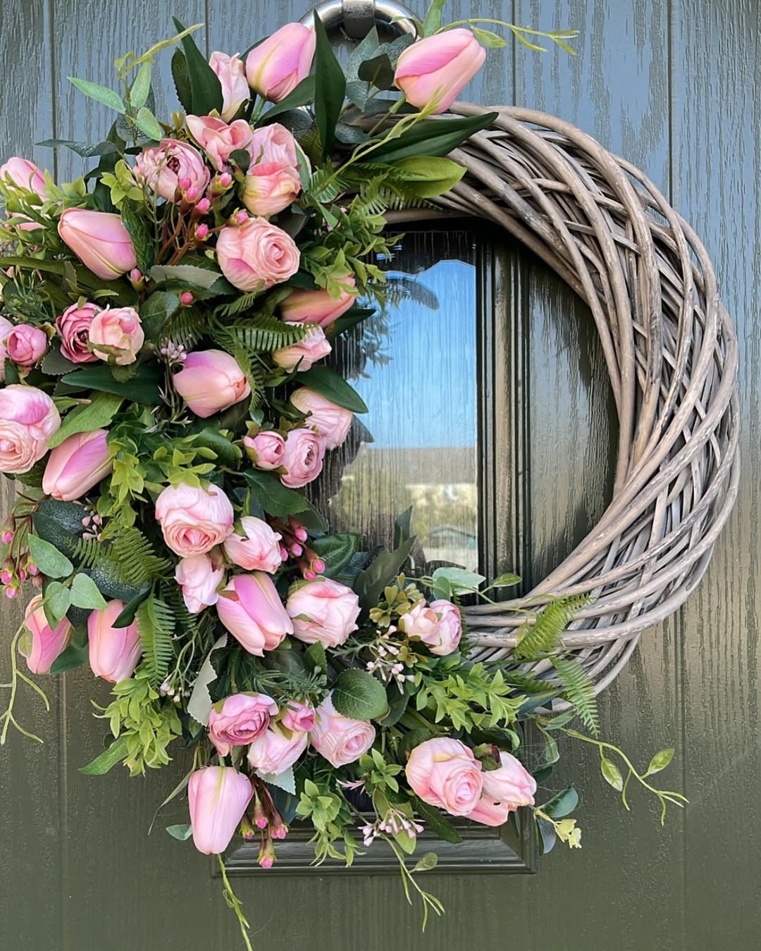 This asymmetrical design brings a modern twist, with florals gathered to one side of a woven base. Pink tulips and roses cascade gently, leaving the rest of the wreath airy and open.