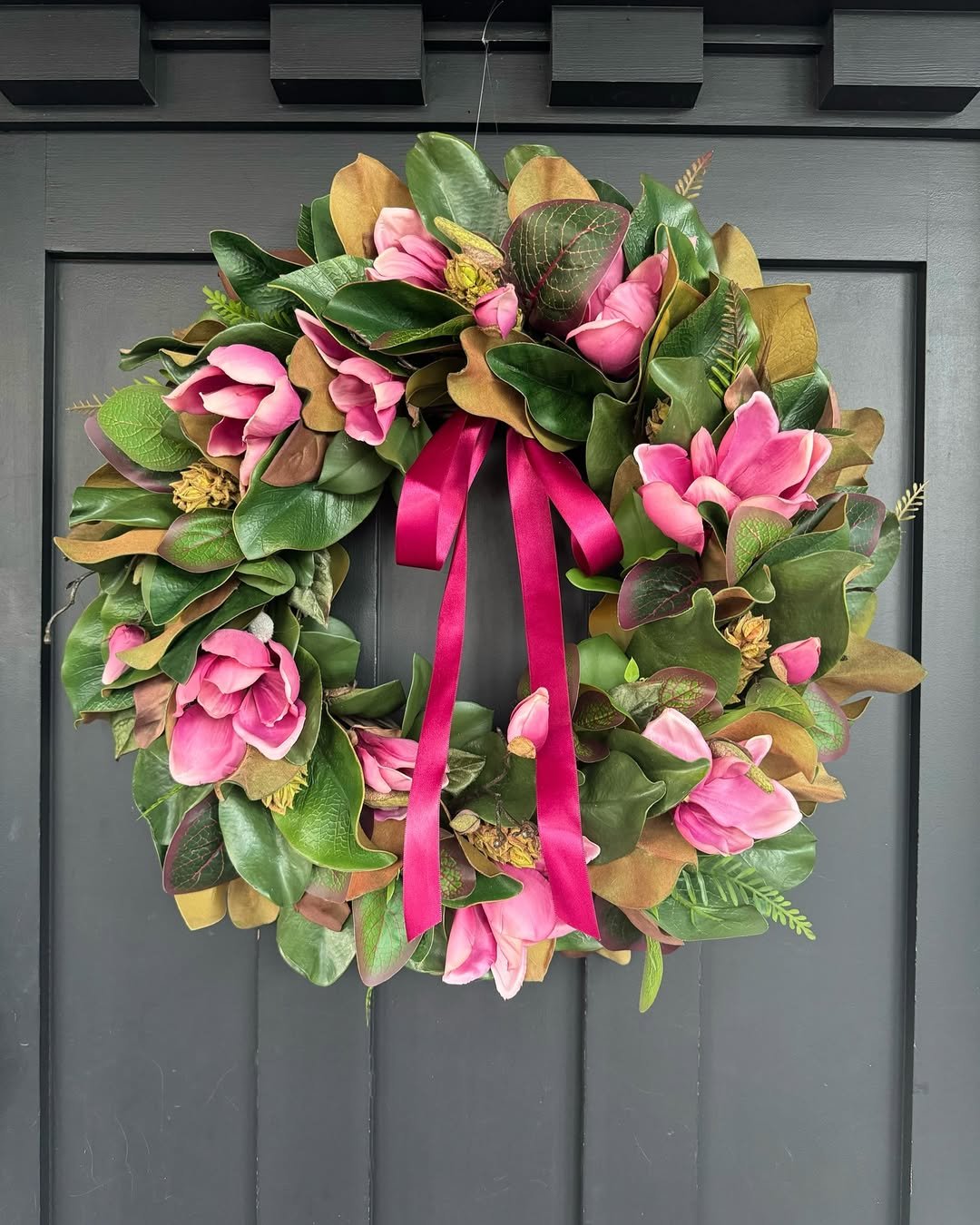 Rich green leaves and soft pink magnolia blooms come together with a deep ribbon that adds just the right amount of contrast. It feels slightly more polished, almost like it’s dressed for an occasion.