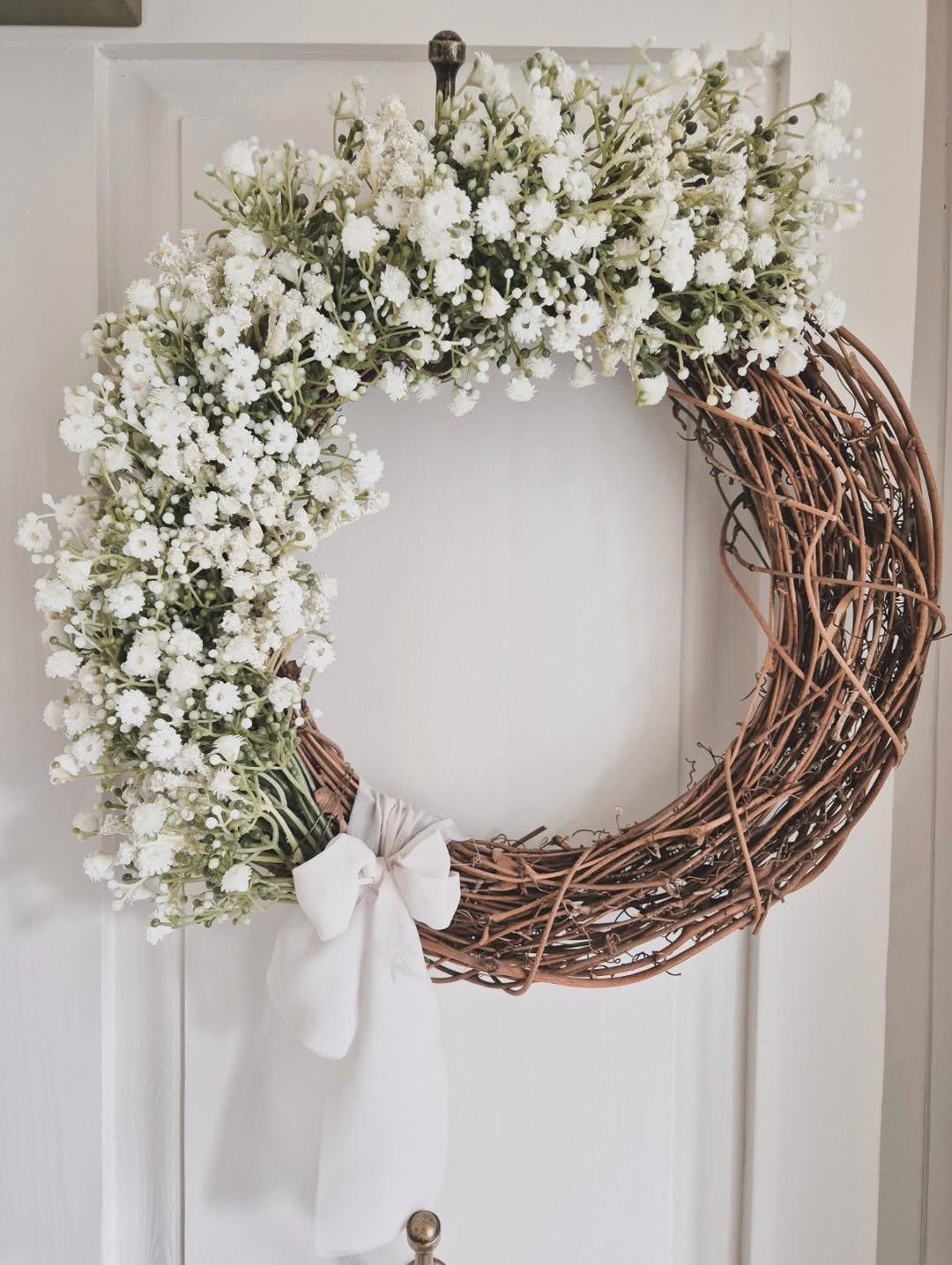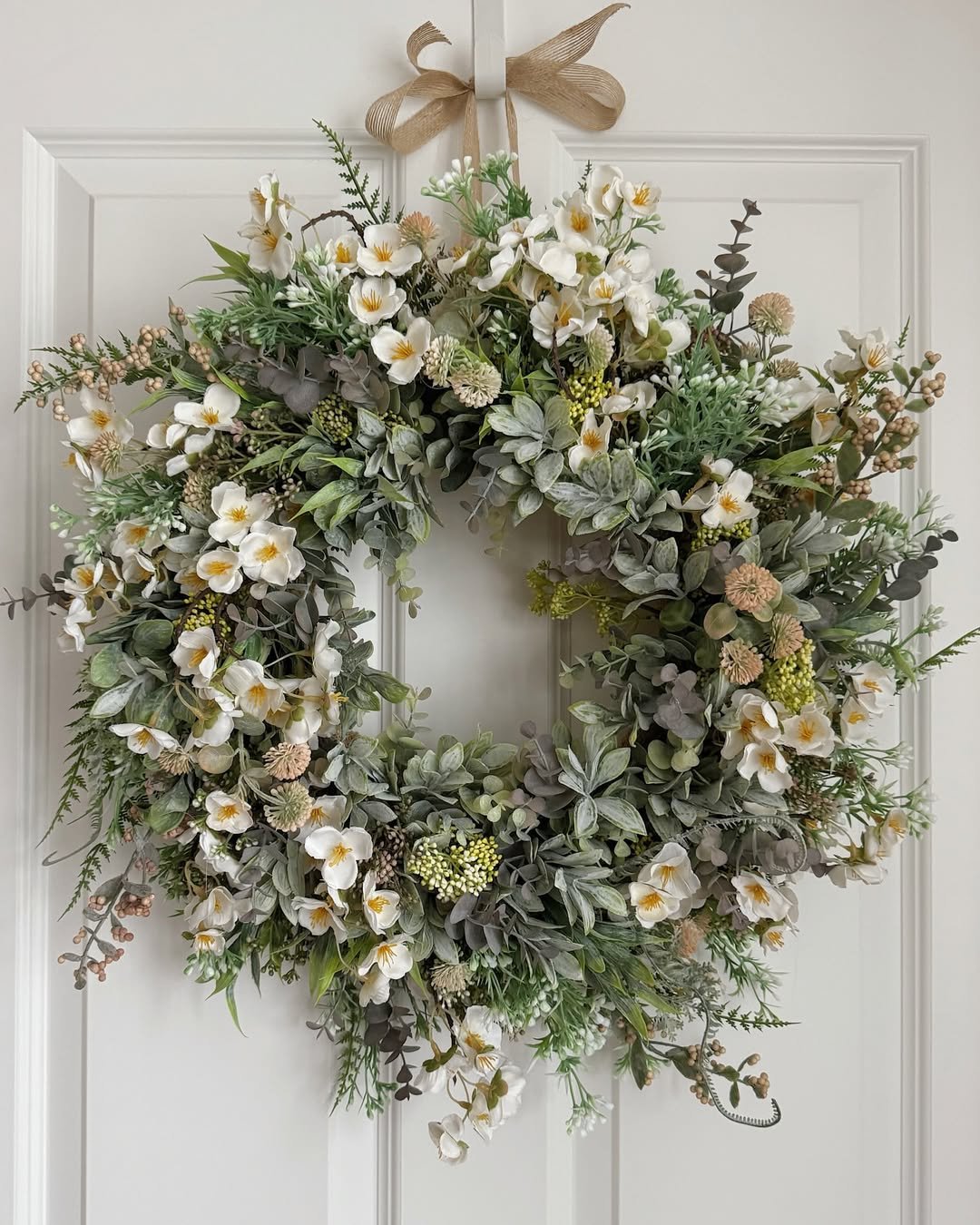 This one feels like a breath of fresh air. A simple grapevine base wrapped halfway in tiny white blooms, finished with a soft fabric bow that adds just enough charm.