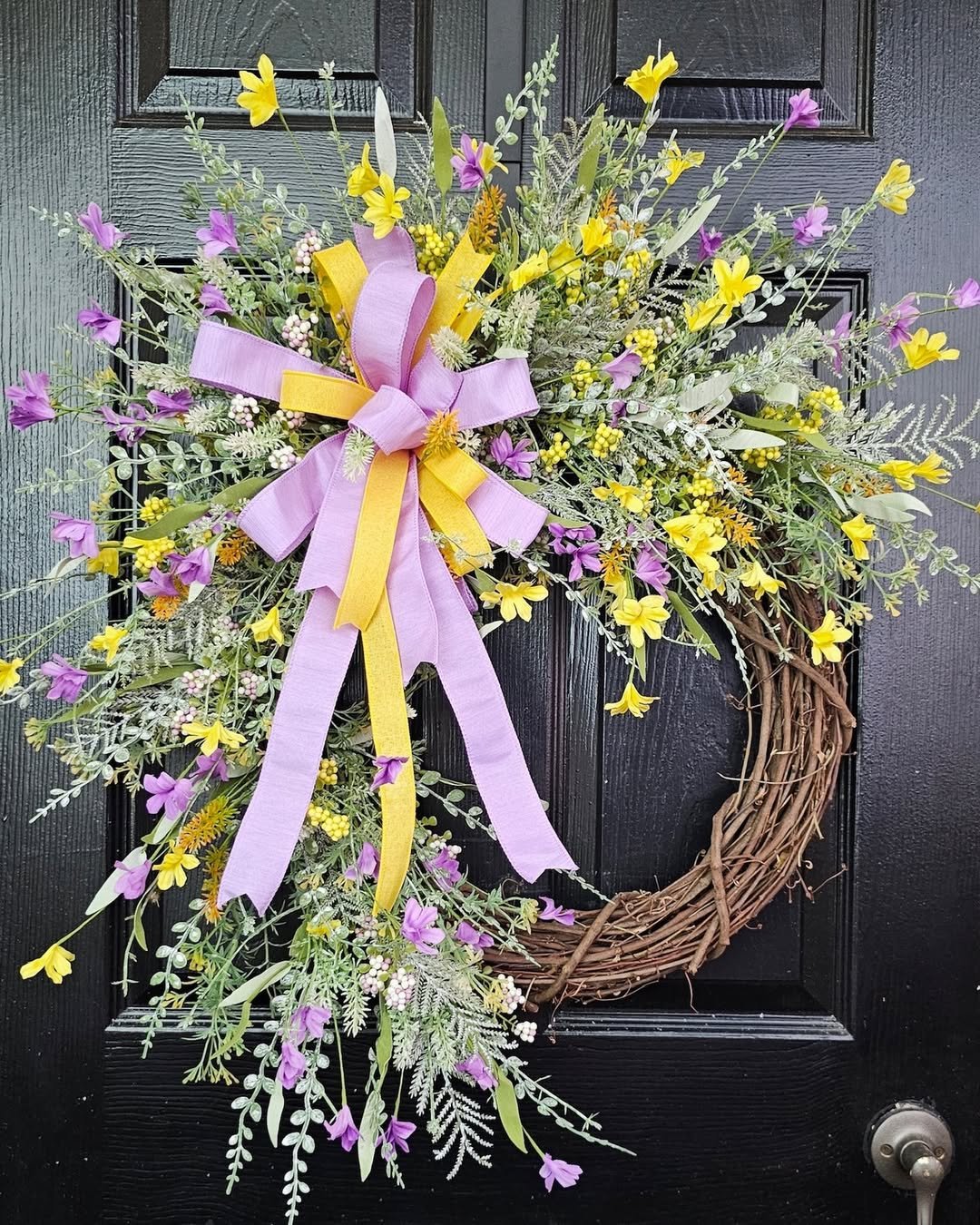 Soft lavender and buttery yellow florals surround a statement bow that instantly draws your eye. The half-wreath design keeps it airy while still feeling full.