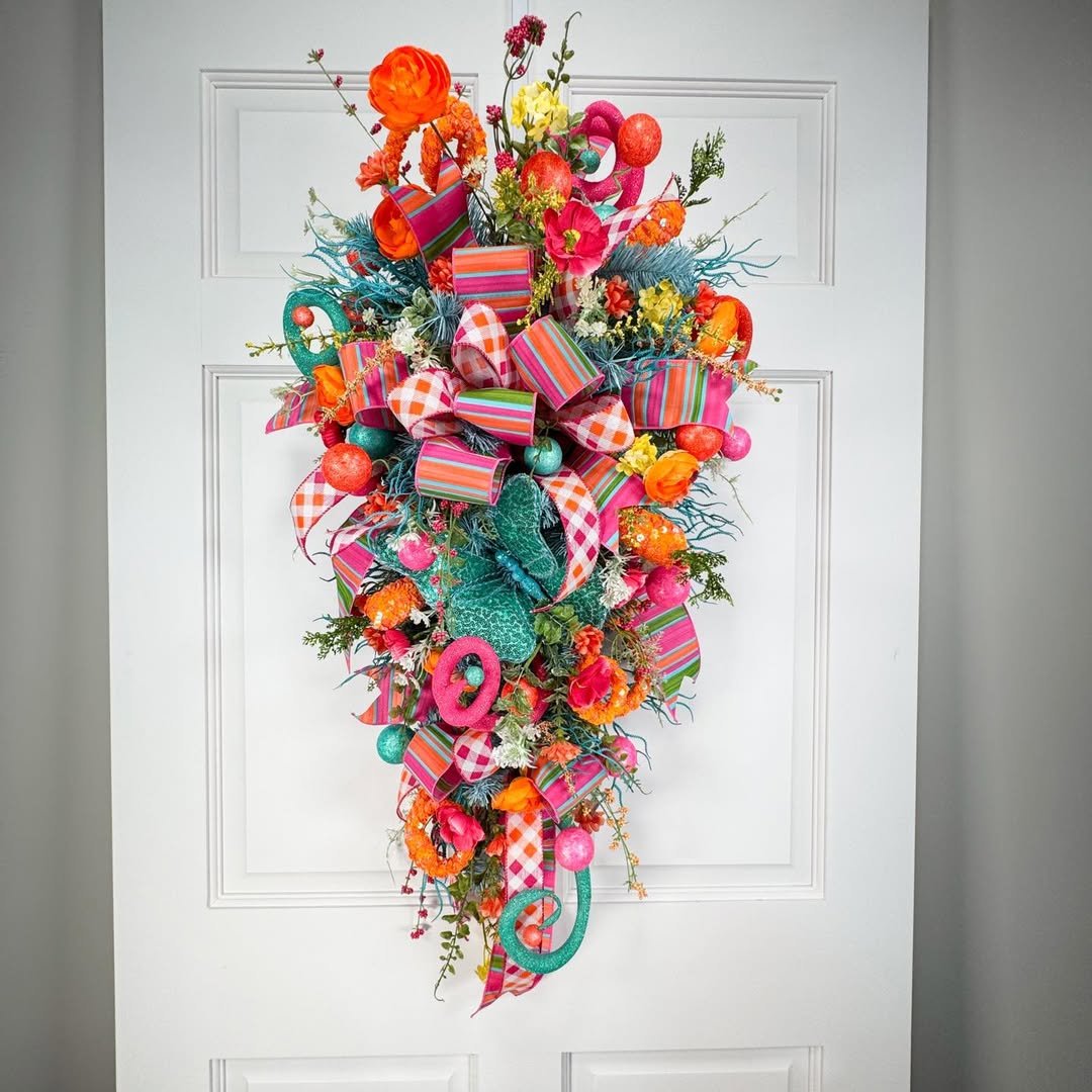 This one is pure personality. Bright ribbons, bold florals, and layered textures cascade downward, turning the traditional wreath shape into something far more dynamic.