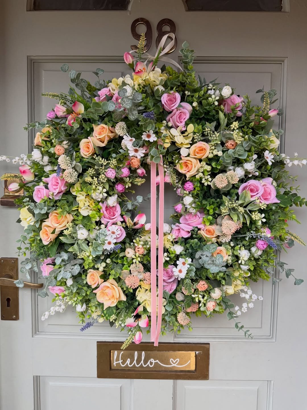 Packed with roses, soft pinks, and layered greenery, this wreath feels lush in the most inviting way. The cascading ribbons add a gentle movement that softens the overall look.