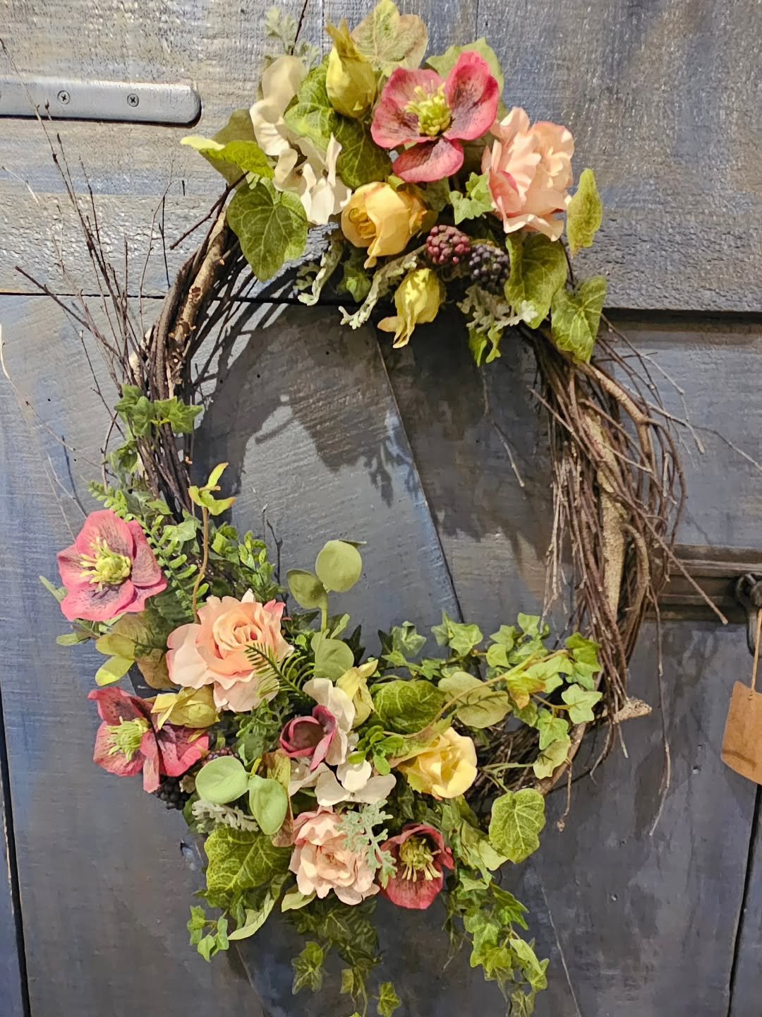 There’s a quiet countryside charm in this one, with its loose grapevine base and florals that feel like they were gathered on a slow morning walk. Soft pinks, buttery yellows, and trailing ivy create that perfectly imperfect balance.