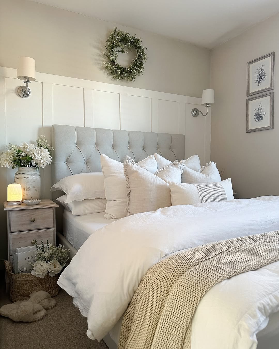 Not all wreaths belong on the front door, and this one proves it. Hung above a tufted headboard, it blends into a calm palette of creams, linens, and soft textures.