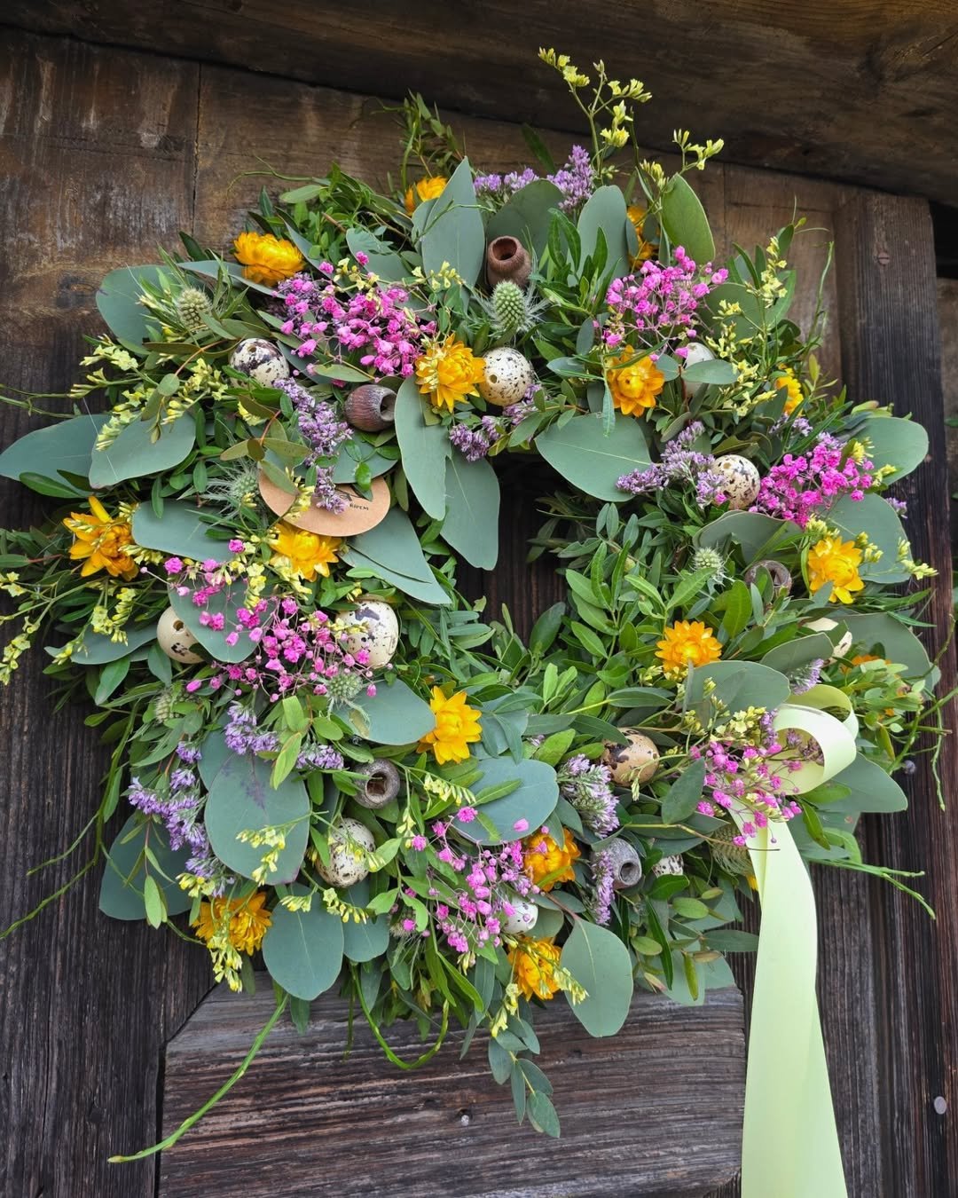 Tucked among eucalyptus leaves and tiny blooms, little nest details add a sense of story to this wreath. It feels like a quiet nod to the season, without being overly themed.