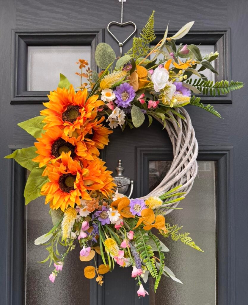 Bright sunflowers anchor this design, bringing warmth and a little bit of sunshine right to the door. The asymmetrical layout keeps it feeling fresh and relaxed.