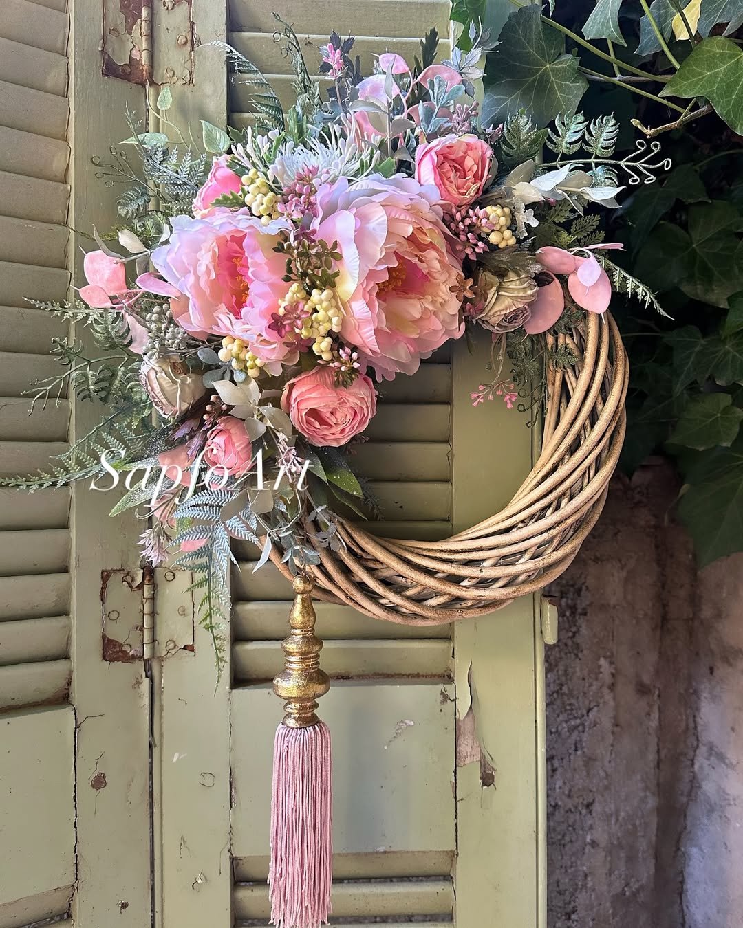 There’s something undeniably romantic about this one. A woven base paired with soft pink blooms and muted greenery, finished with a long tassel that adds movement and a hint of old-world charm.
