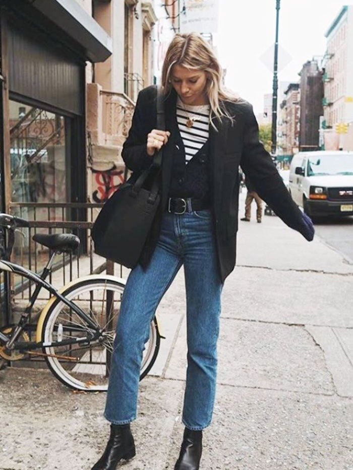 There’s something timeless about a striped top paired with straight leg denim. Add a relaxed cardigan and structured blazer on top, and the whole outfit takes on that cool city-ready vibe.
