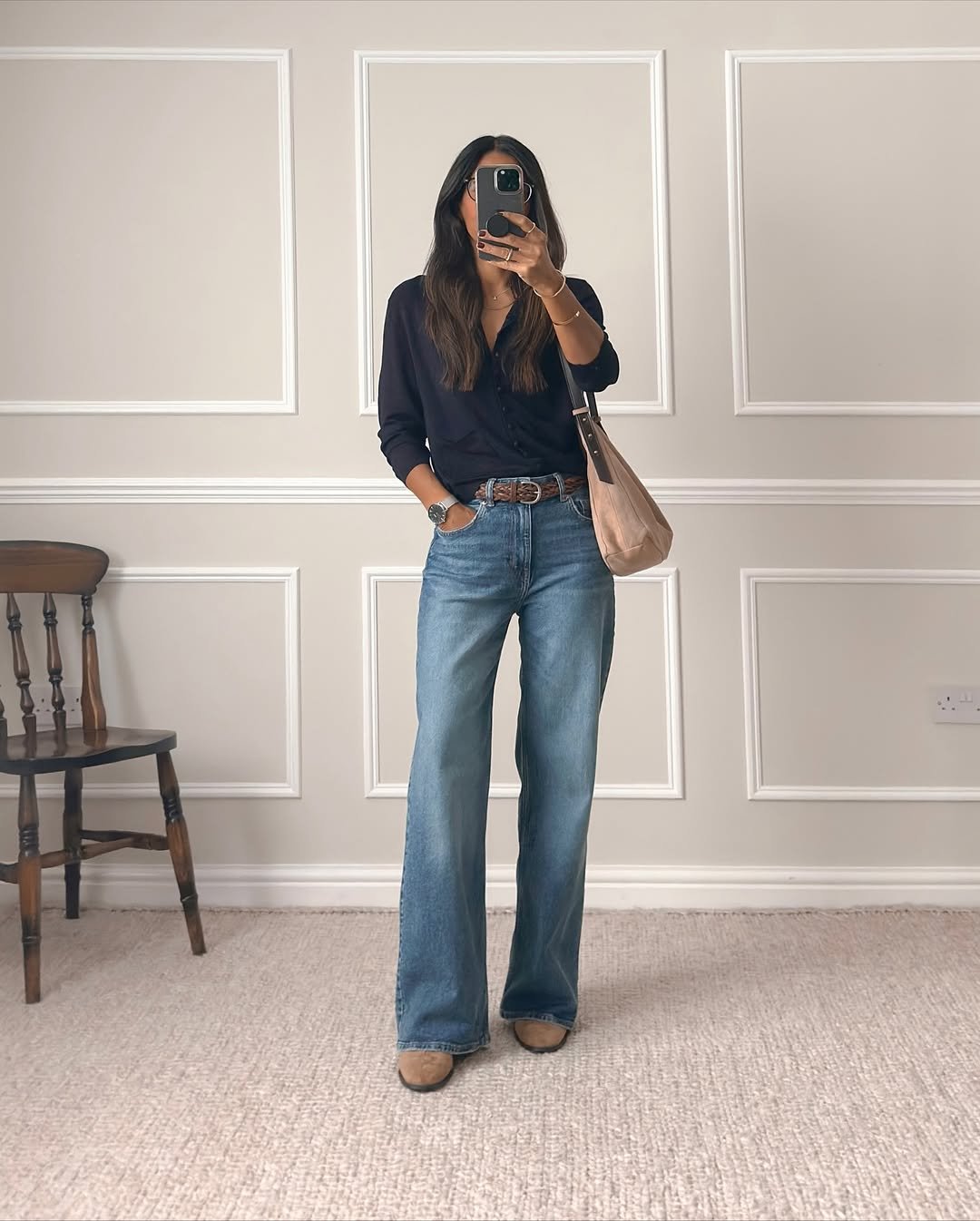 A black blouse paired with classic denim will never fail you. The tucked-in shirt creates a flattering shape, while the simple belt adds that subtle detail that makes the outfit feel intentional.