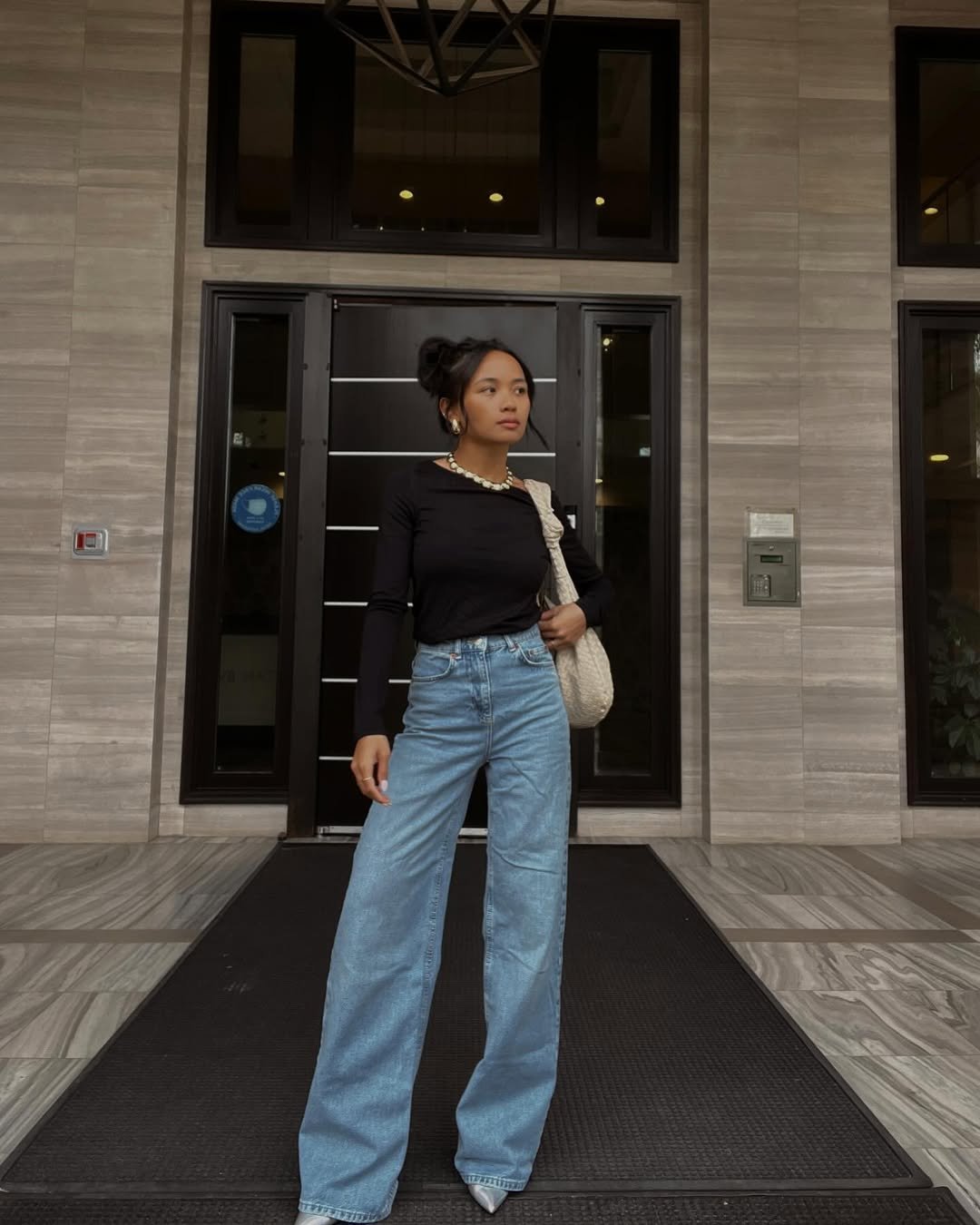 There’s something effortlessly cool about an all-black base paired with classic denim. The fitted black knit keeps the silhouette sleek, while the dark straight leg jeans add structure that feels both modern and timeless. Toss a blazer over your shoulder and suddenly the whole look reads polished without losing that relaxed street style energy.
