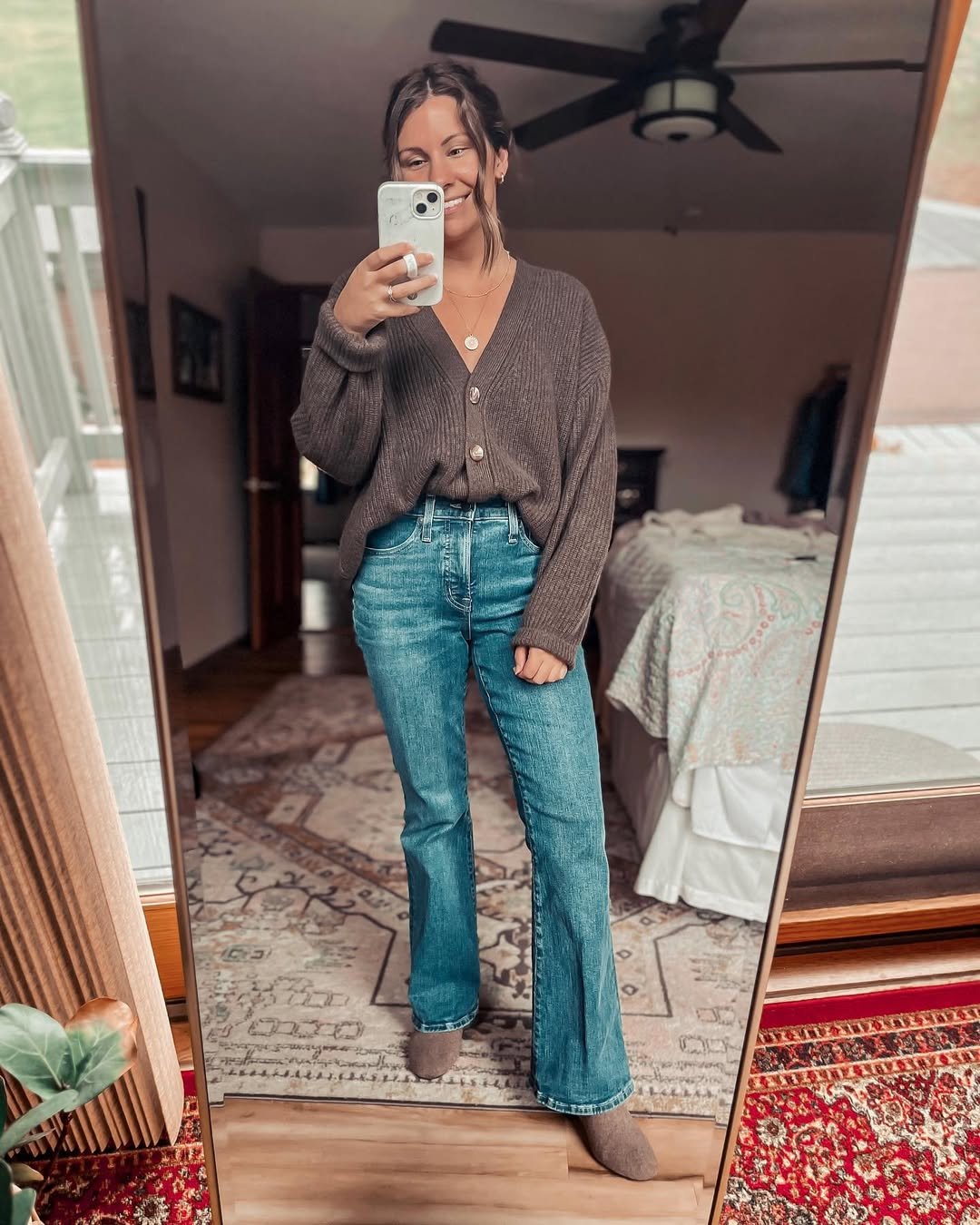 This outfit has that effortless weekend charm that makes straight leg jeans so easy to love. A slouchy chocolate cardigan tucked slightly into classic denim creates shape while still feeling relaxed. The warm brown tone softens the whole look, making it feel cozy and approachable.