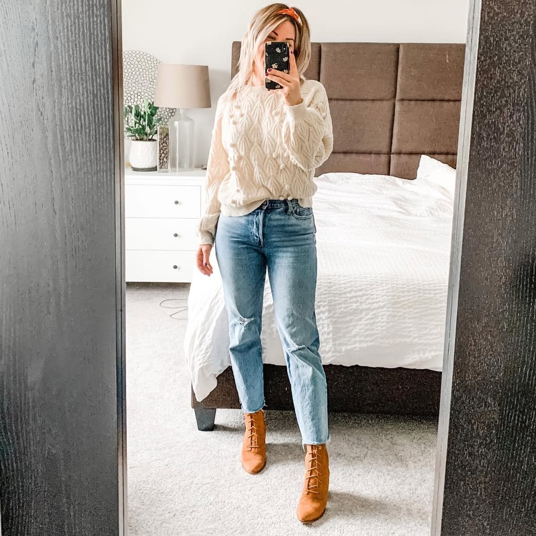 There’s something comforting about a chunky knit paired with classic denim. The textured cream sweater adds warmth and softness, making the outfit feel like the perfect pick for cooler mornings or relaxed weekend plans.