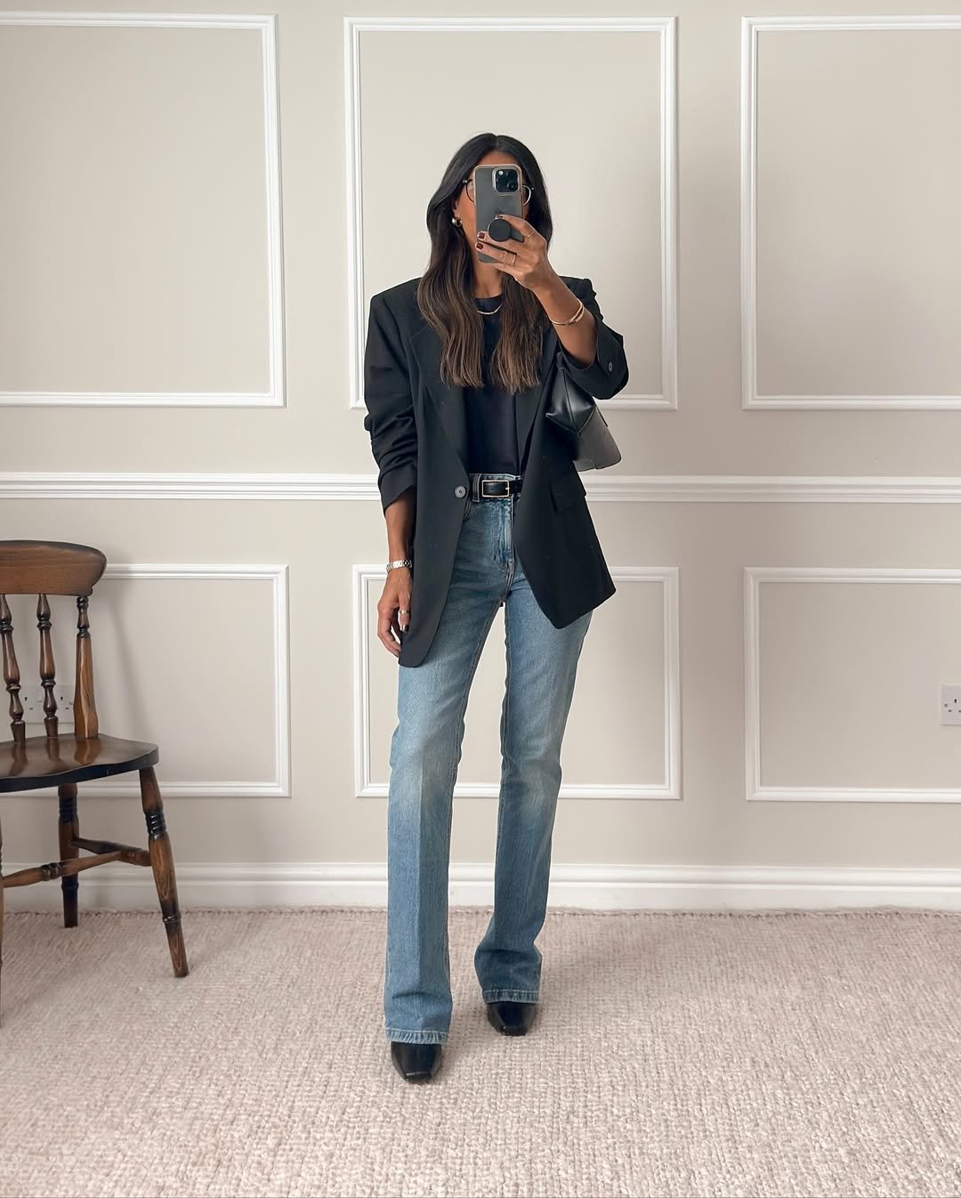 Sometimes the most stylish outfits are the simplest ones. A relaxed black blazer over a classic tee with straight leg jeans feels timeless, like something you could wear year after year without it ever looking dated.