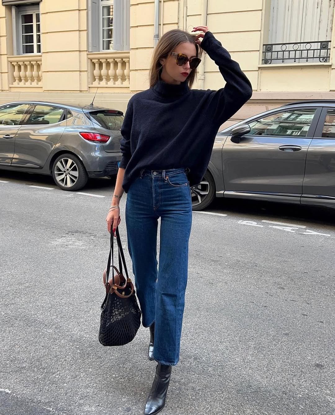 This look carries a little Paris street style magic. A soft black turtleneck tucked into dark straight leg jeans creates a silhouette that feels sleek yet comfortable. It’s simple, but that’s exactly what makes it work.