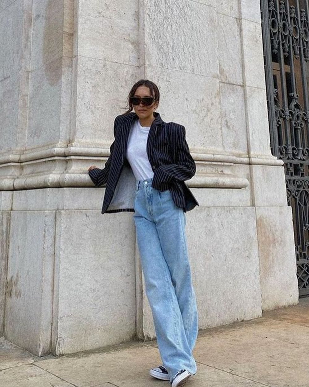 A tailored pinstripe blazer instantly changes the tone of a simple outfit. Here it’s layered over a crisp white tee and loose light-wash jeans, creating that perfect contrast between structured and relaxed pieces.