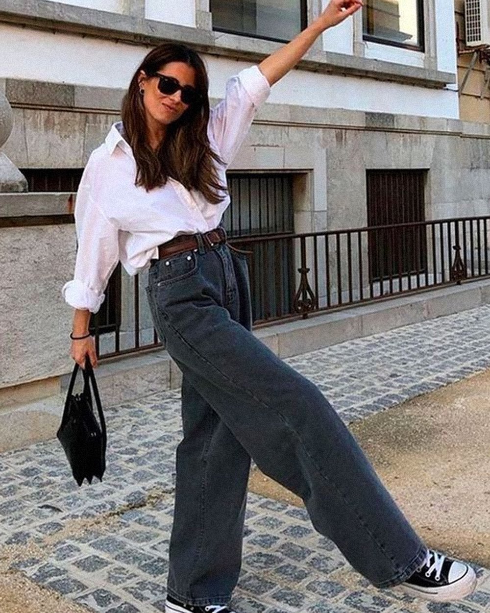 This look has that carefree energy that makes denim outfits feel fun again. A slightly oversized white button-down tucked into charcoal straight leg jeans creates a relaxed shape that still feels intentional.