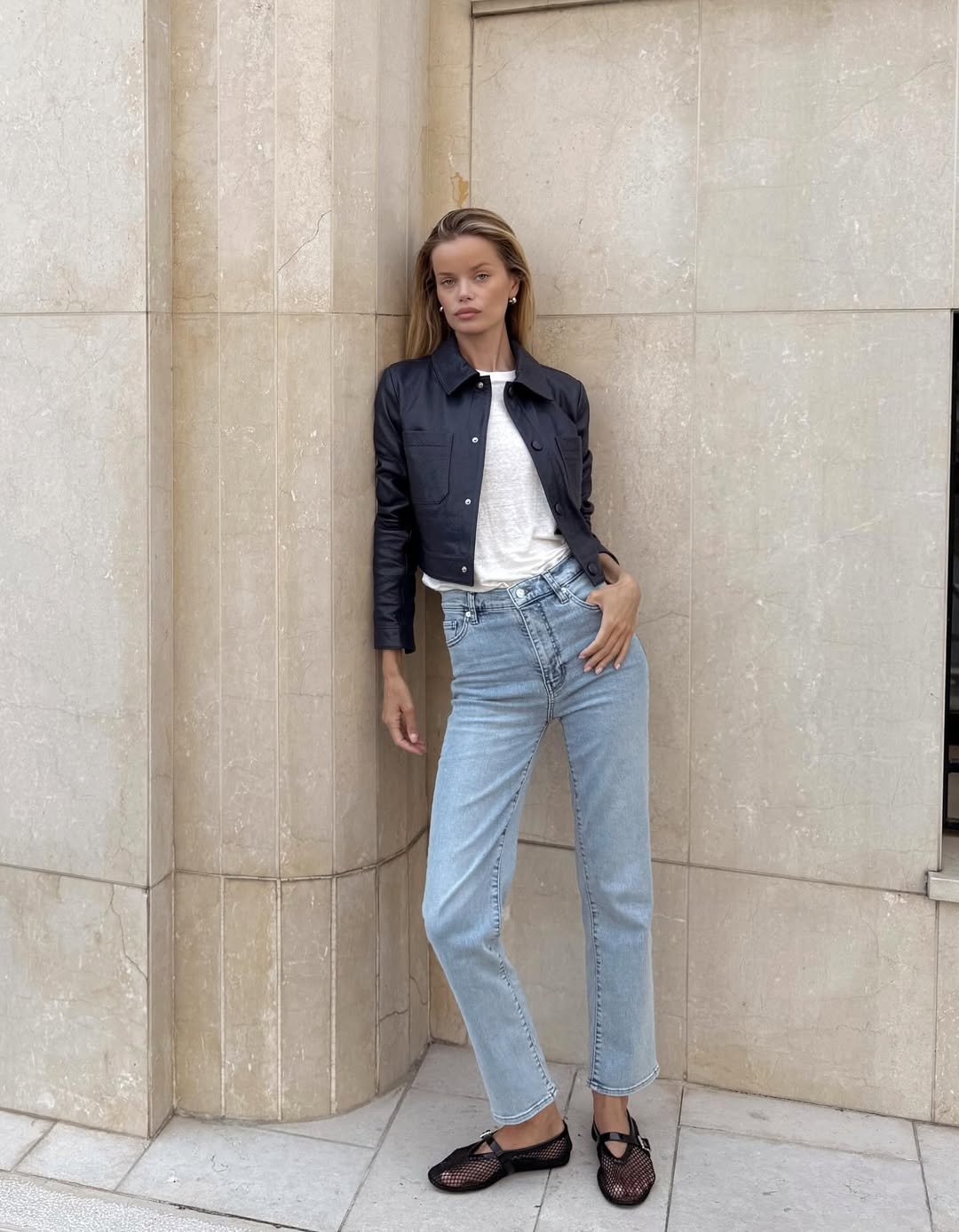 Light wash straight leg jeans keep things relaxed, and those mesh flats introduce just enough personality. It’s cool, modern, and feels like something you’d wear while wandering through a stylish city neighborhood.
